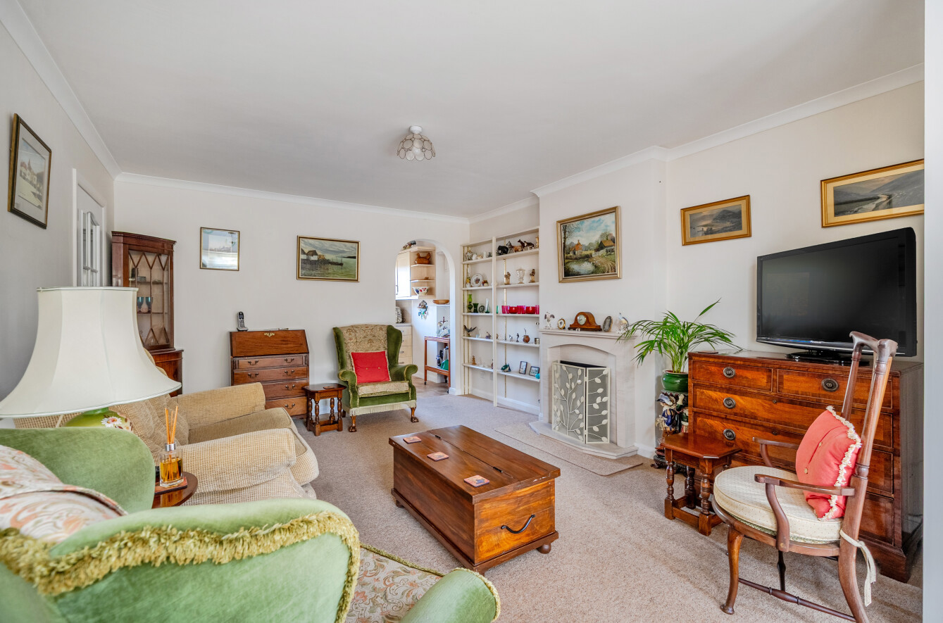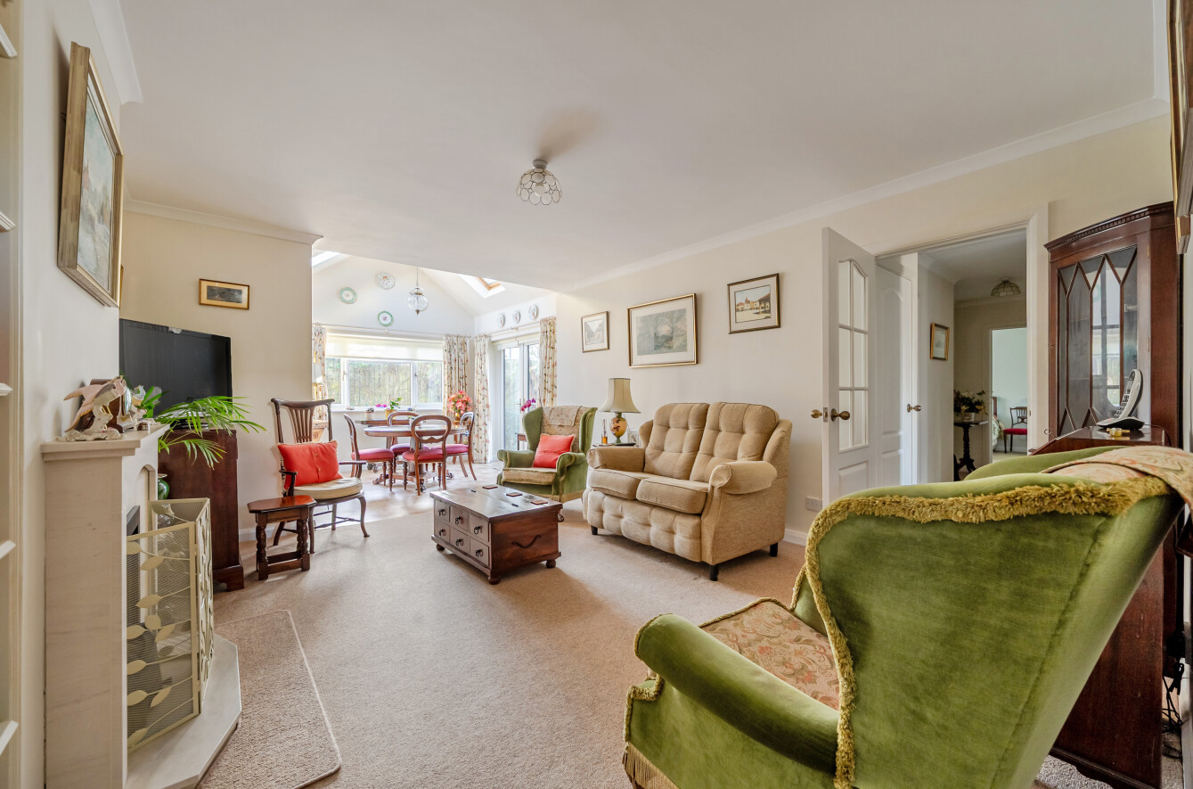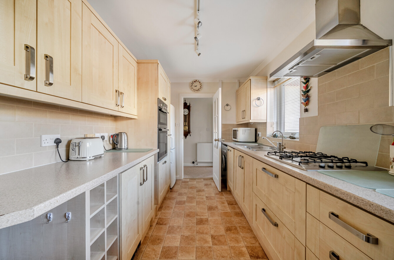 The front door opens into a welcoming porch with generous built-in storage. A further door leads into the main hallway, which serves all principal accommodation. To the left is a modern fitted kitchen equipped with a range of integrated appliances, flowing through to the sizeable sitting room, which can also be accessed directly from the hall.
