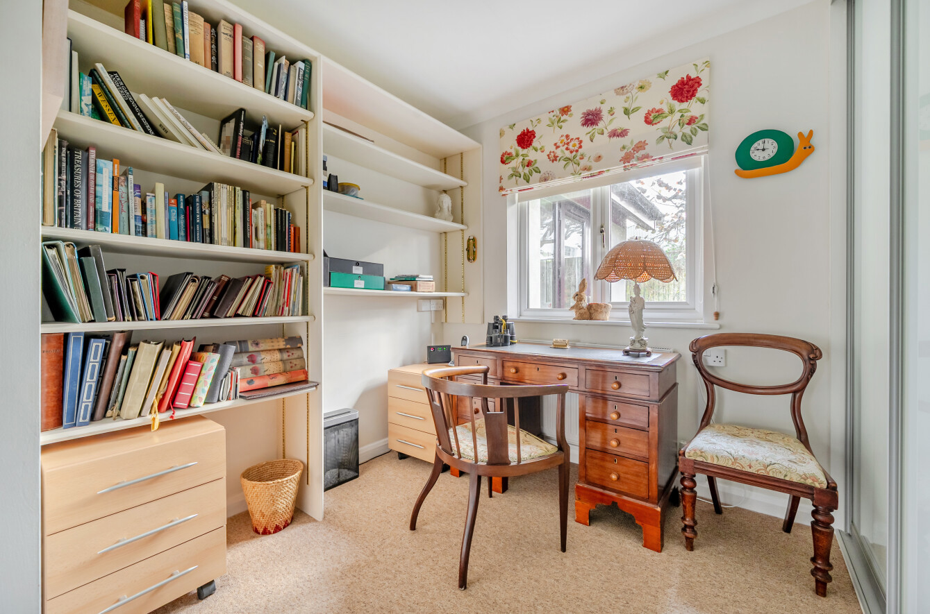 There are three well-proportioned bedrooms, all benefiting from ample built-in storage, with the smallest currently laid out as an office. A contemporary family shower room completes the internal accommodation.