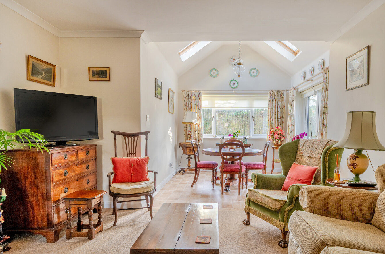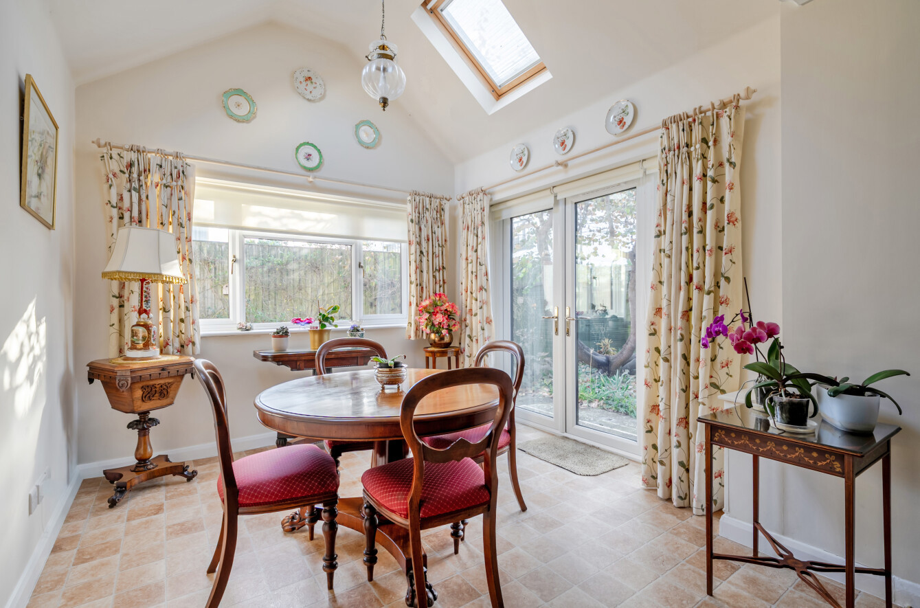 The property has been extended from the sitting room to create a superb dining room, ideal for entertaining, featuring skylights and double doors opening onto the rear garden. The dining area also benefits from underfloor heating.