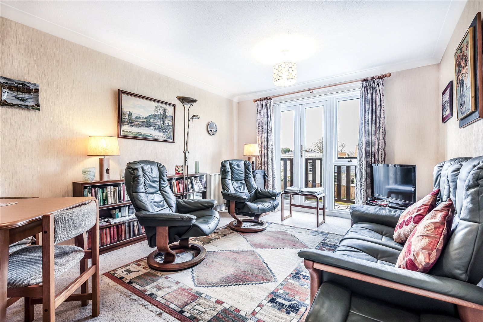 The property is accessed via a secure entrance, which provides access to only two apartments.Located on the first floor, the apartment features a private door leading into an inner hallway with storage cupboards and doors to two double bedrooms. The modern bathroom includes both a separate shower and bath. The principal bedroom also features an ensuite WC. The apartment boasts a modern kitchen and a spacious sitting/dining room, which opens onto a balcony with rooftop views over the town. Externally, there are communal gardens and allocated parking.