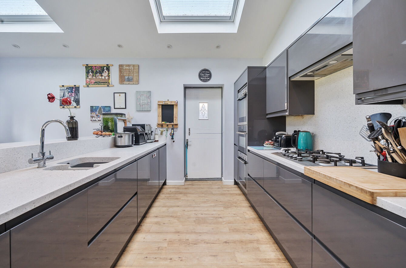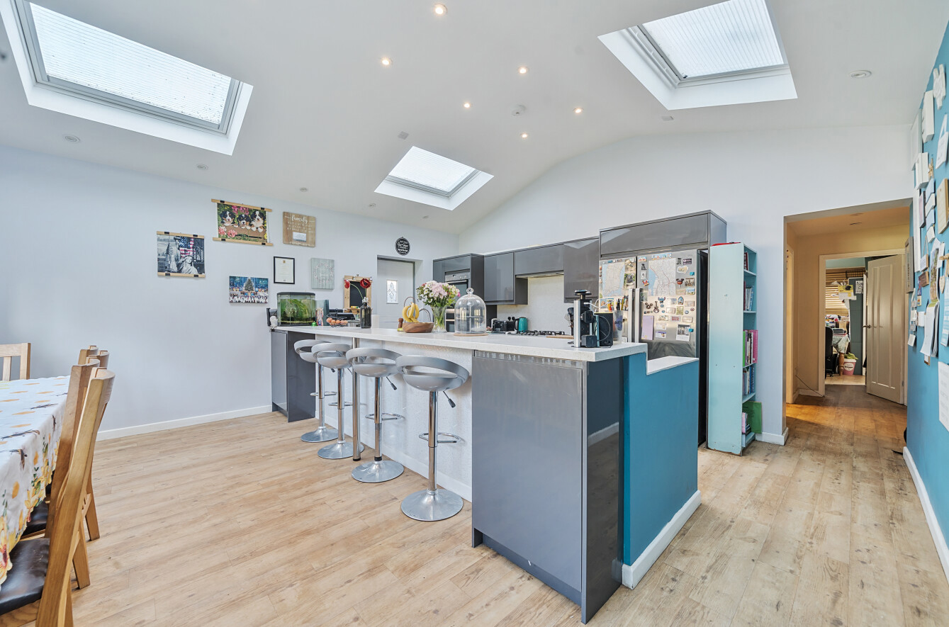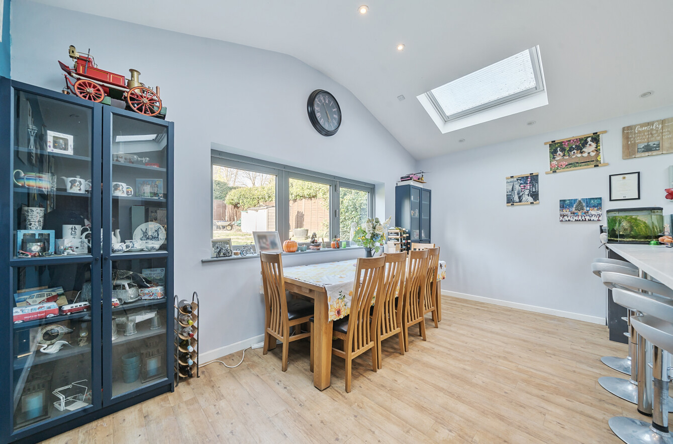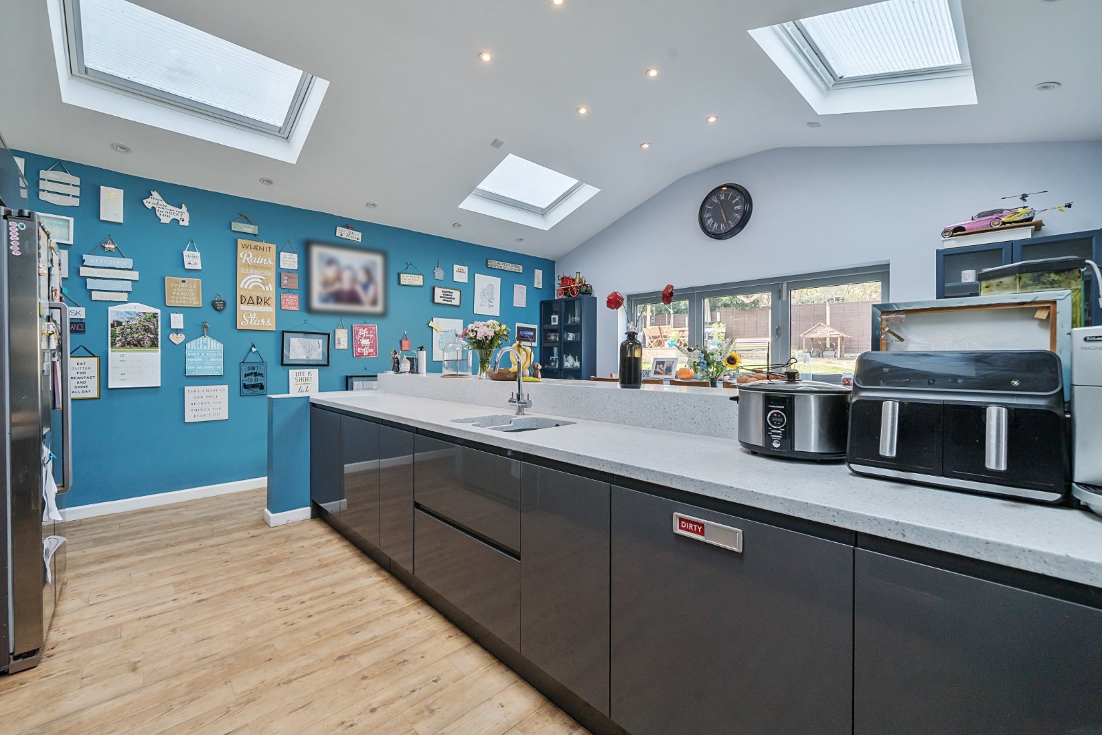 A particular highlight of the home is the stunning open-plan kitchen/dining room, designed to be the heart of the house. With a vaulted ceiling, skylights, and bright, airy interiors, this space provides an ideal setting for both everyday family life and entertaining.