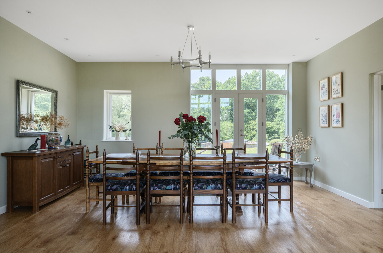 The entrance leads into a striking dining hall, flooded with natural light from a full-height window and floor-to-ceiling glass. Double glass doors open onto the rear garden, offering picturesque views across the grounds. To the right of the hallway is a cloakroom, a storage cupboard, and a sitting room with double doors leading out to a secluded patio. From the dining hall, steps take you down to the heart of the home – a spacious, open-plan kitchen/breakfast/family room. This beautifully proportioned space includes a modern fitted kitchen with island and bar style seating, integrated appliances, all with ample space for dining and entertaining.