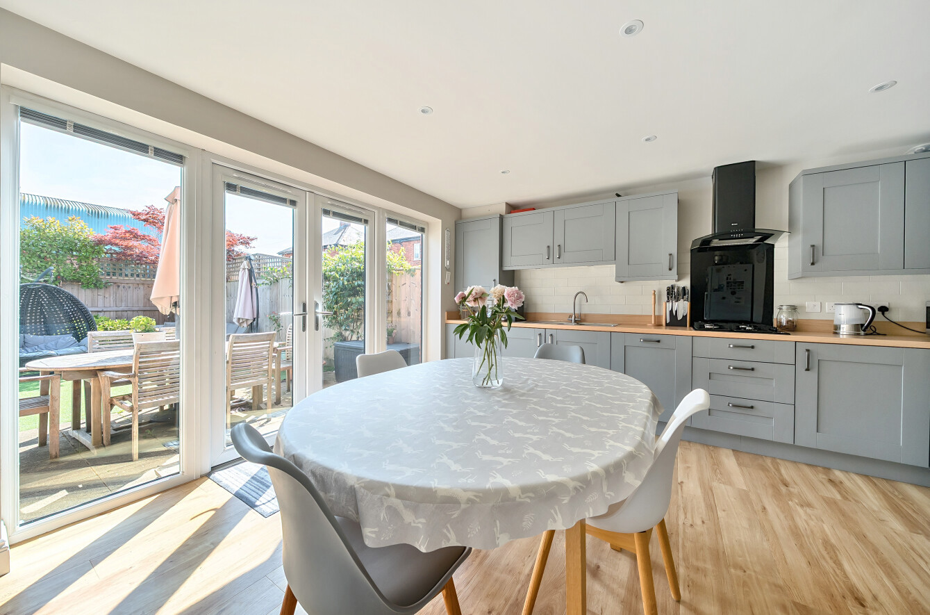 The main entrance, discreetly positioned to the side of the house, opens into a spacious and welcoming hallway. To the right lies a comfortable sitting room, while to the left is a stylish guest cloakroom and a stunning open-plan kitchen/dining room. Perfect for entertaining, the kitchen is fully fitted and features double doors that lead out to the enclosed rear garden.