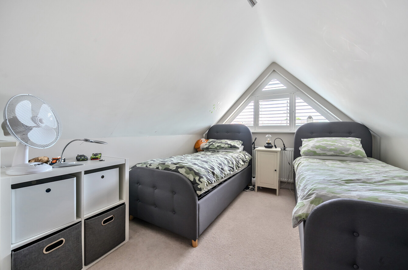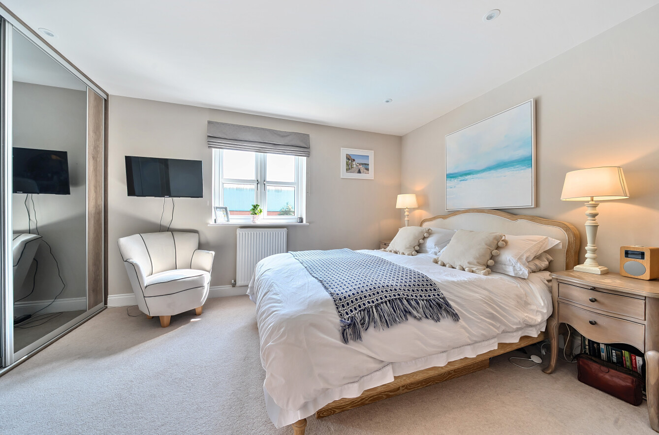 A central staircase rises to the first floor, home to the elegant principal bedroom with its own en-suite shower room, a generous second double bedroom, and a well-appointed family bathroom. The top floor offers two further spacious double bedrooms and additional built-in storage on the landing.