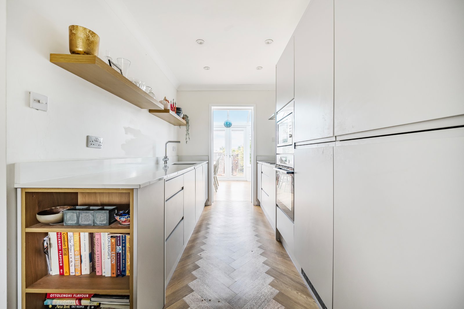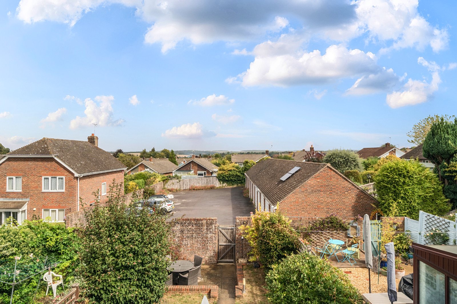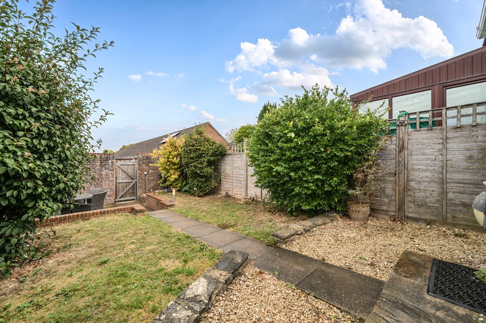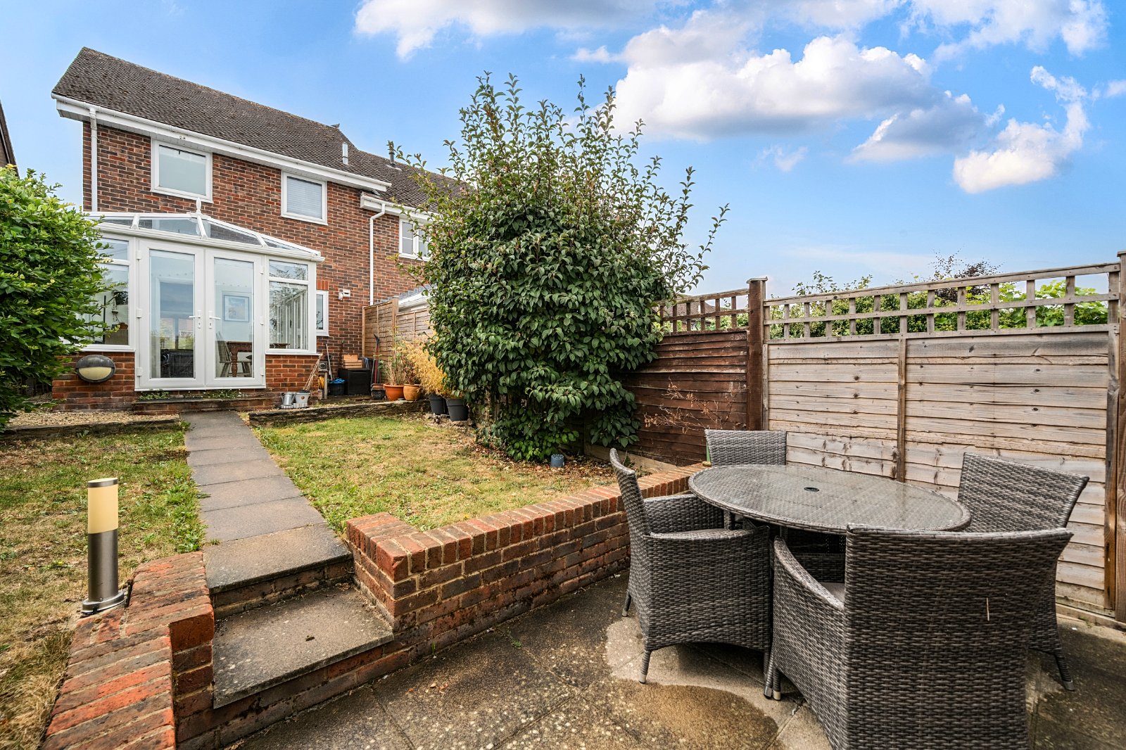 The rear garden is private and enclosed, mainly laid to lawn with a patio at the far end—perfect for al fresco dining. A rear gate provides access to the parking area and garage.