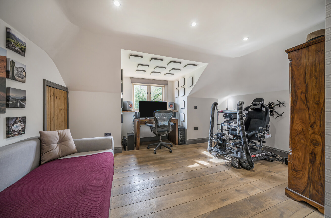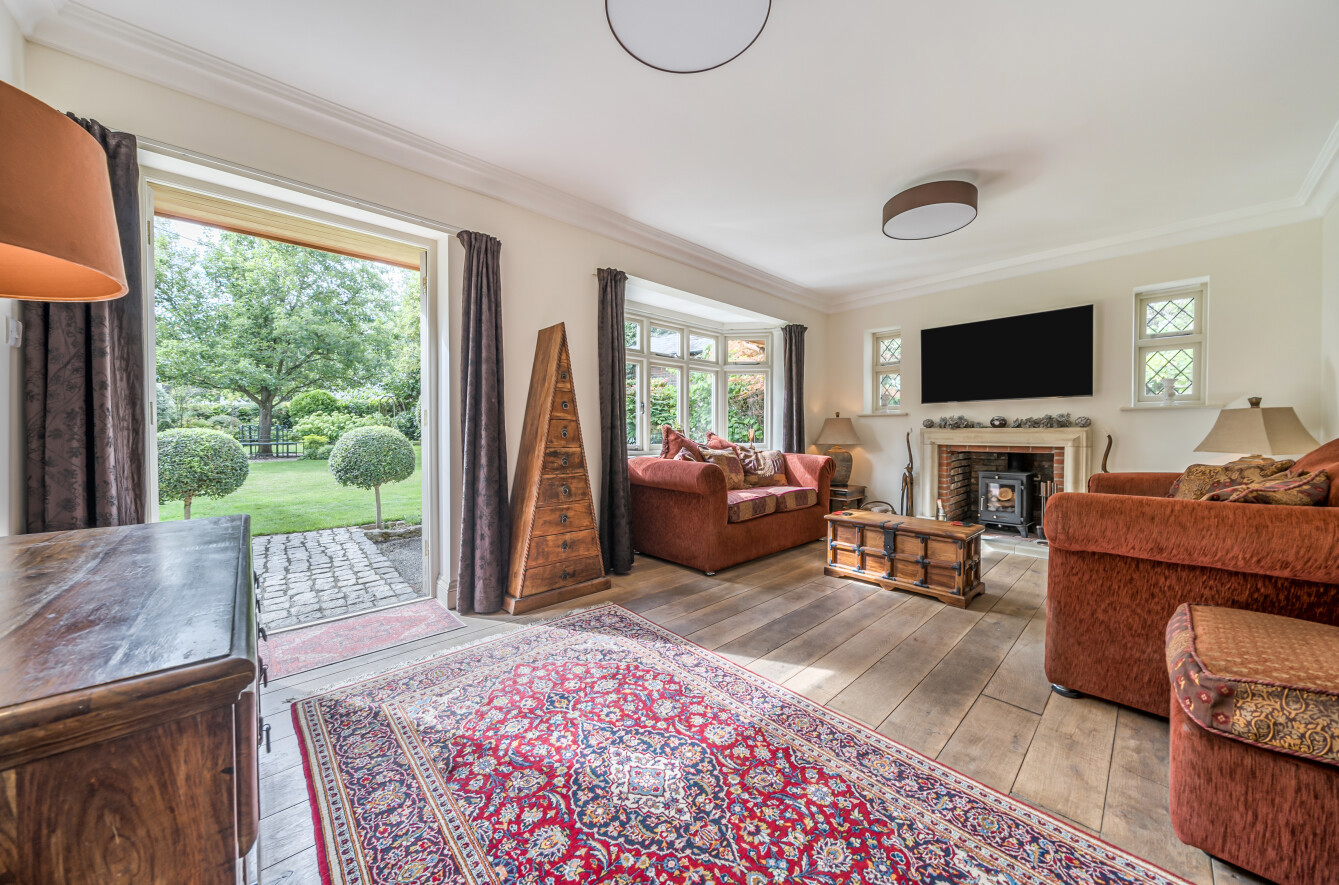 To the left is the versatile third bedroom, equally suited as a study or additional reception space. Further along is a well-proportioned yet cosy sitting room, with a wood-burning stove set within a striking mantle, double doors opening to the rear garden, and a charming bay window overlooking the grounds.