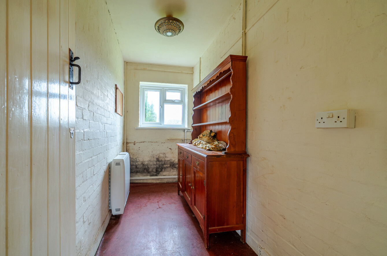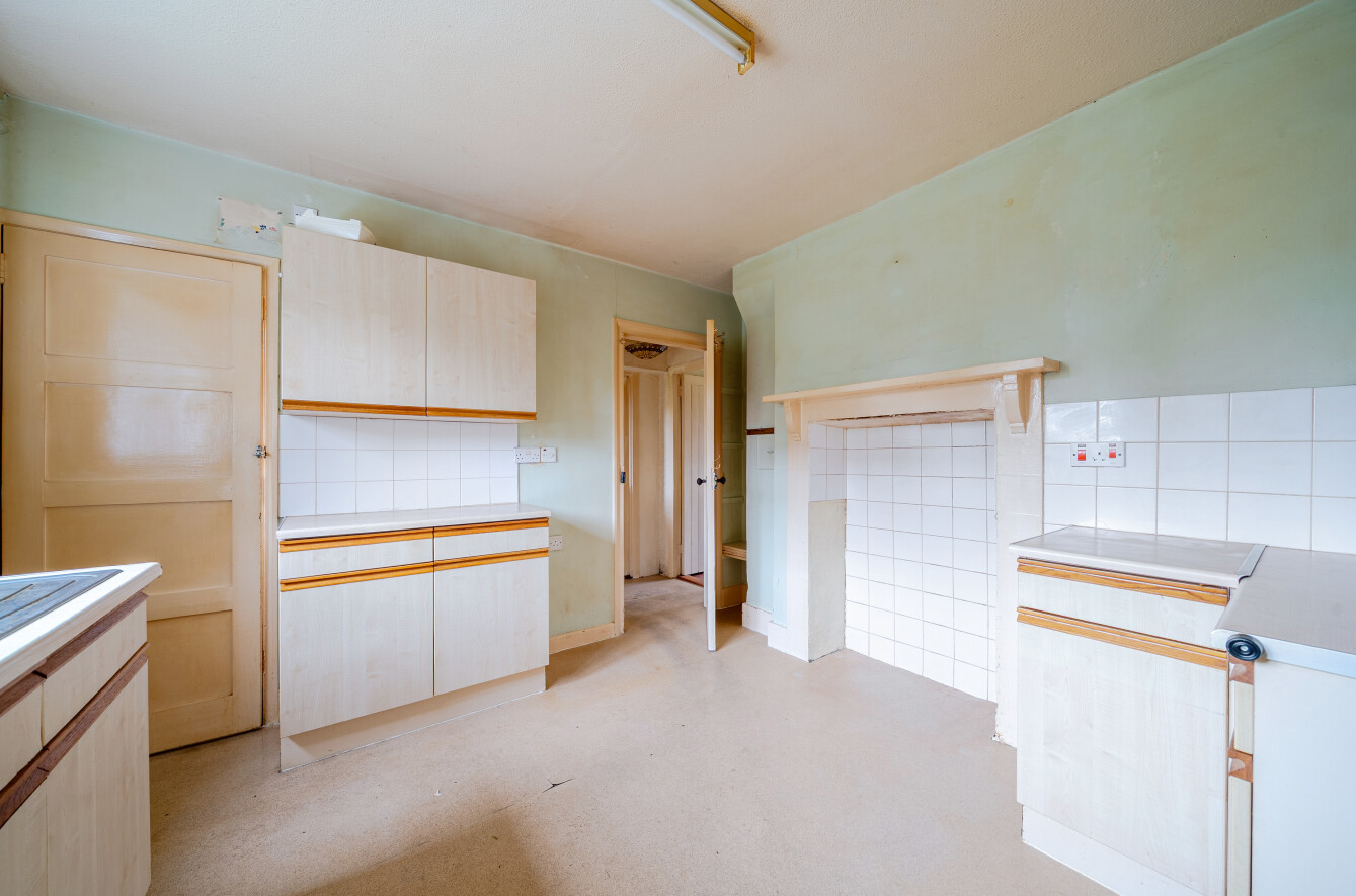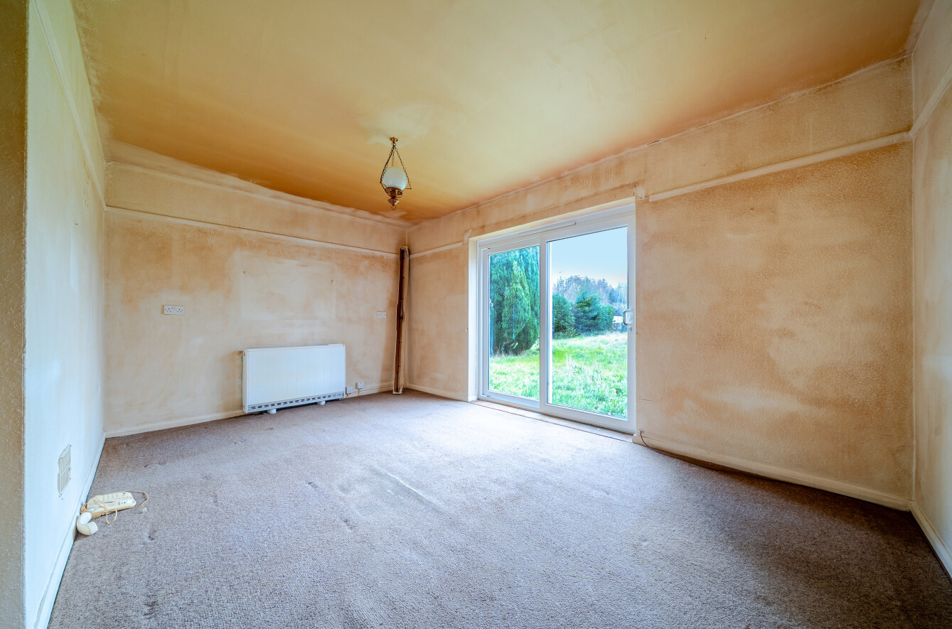The current layout includes a front porch leading into the entrance hall, a spacious kitchen, and a lobby giving access to a W.C., utility room, and the rear door. The sitting room is well-proportioned, measuring 15ft x 10'10", and features sliding doors opening onto the front garden.