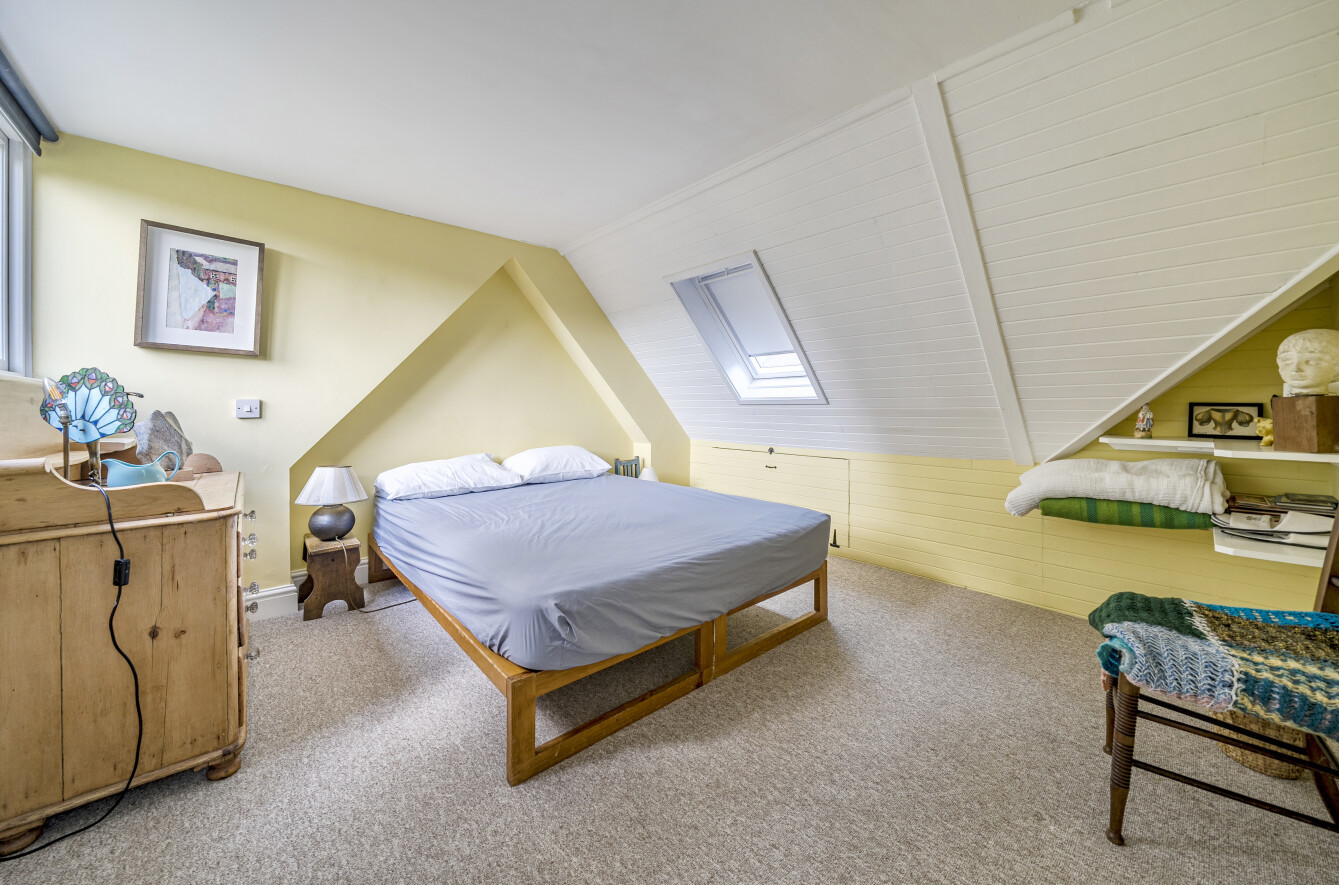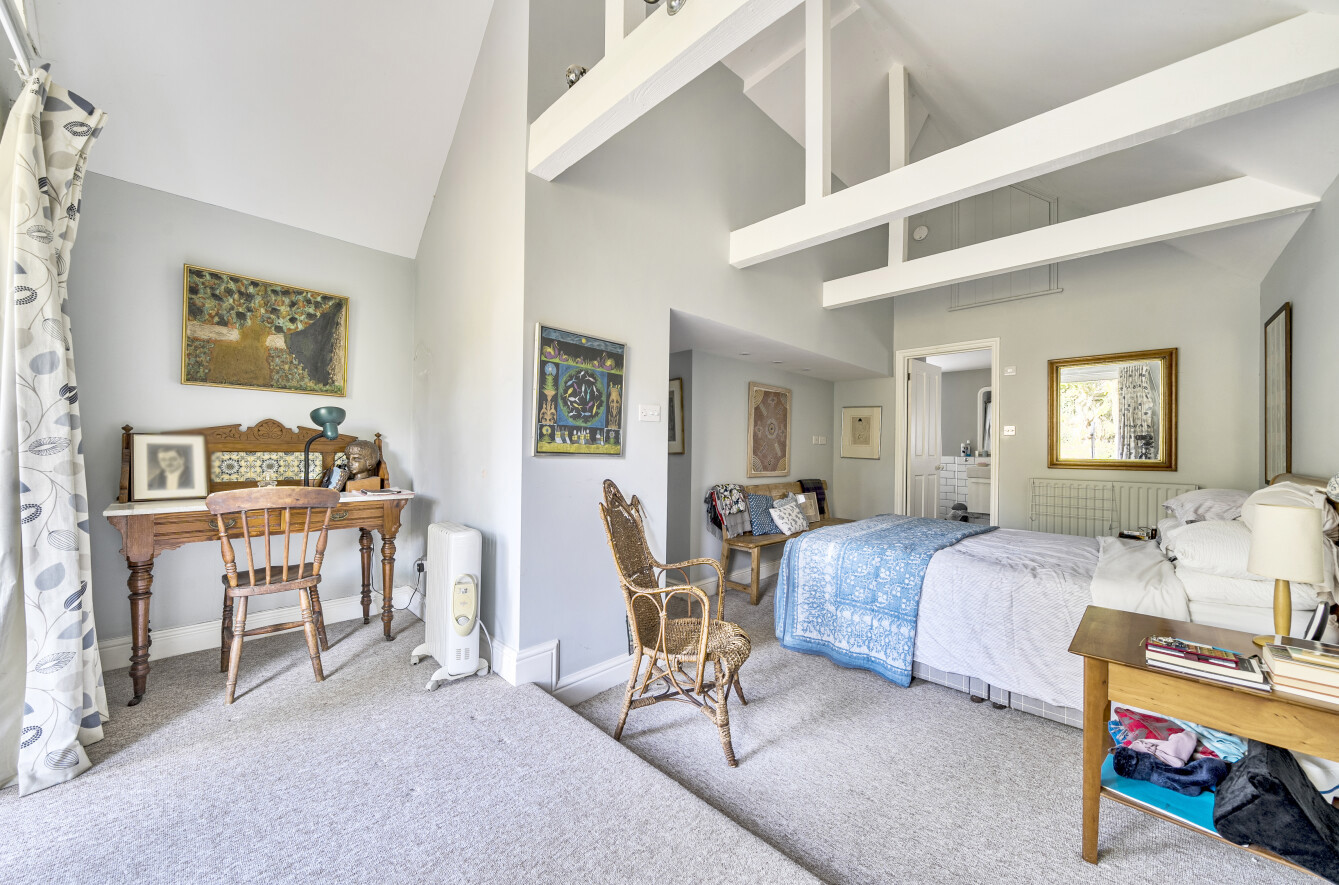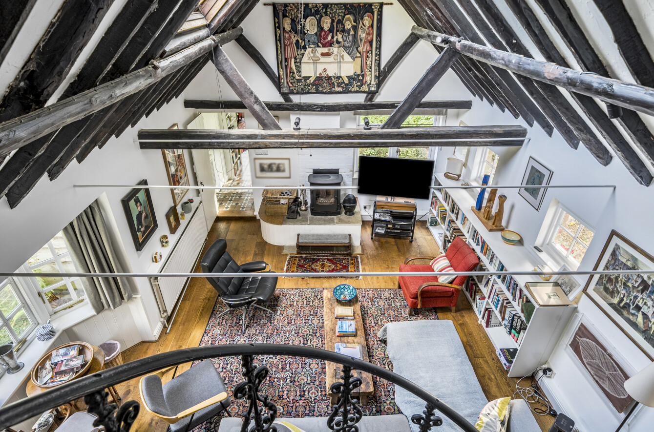 The property is accessed via a private track off Church Lane and enjoys ample off-road parking. Inside, the home offers deceptively spacious and versatile accommodation, full of warmth and individuality. The front door opens into a welcoming entrance hall. To the left, you’ll find an impressive sitting room featuring a vaulted ceiling, a wood-burning stove, and a striking wrought-iron spiral staircase leading up to a mezzanine office space.