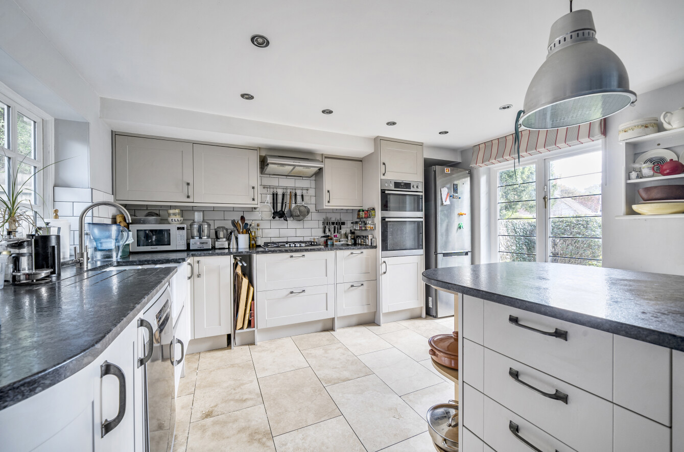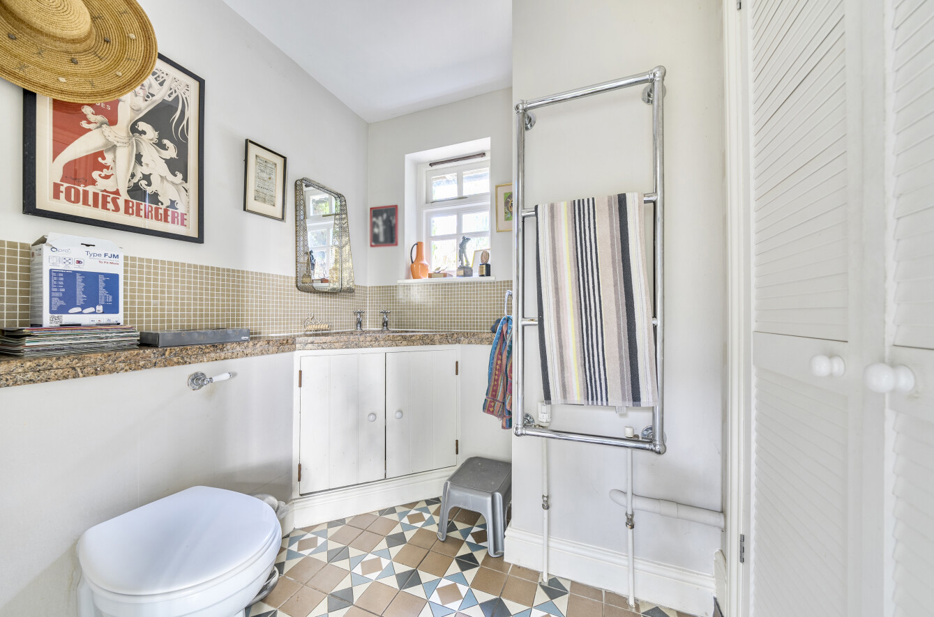 Beyond the sitting room lies the generous principal bedroom, complete with an en suite bathroom (with separate bath and shower), a dressing room, and sliding doors that open directly onto the garden. Straight ahead from the entrance hall is a cloakroom with a useful storage cupboard housing the utilities. Steps lead down into a stunning open-plan kitchen and additional sitting area—an ideal space for both everyday living and entertaining.
