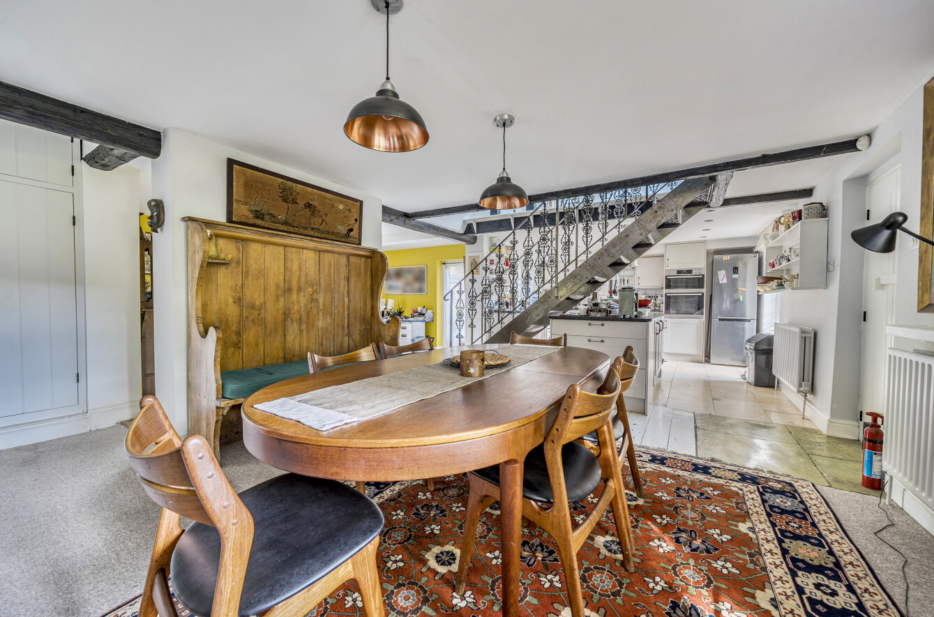 The modern kitchen is fitted with a range of integrated appliances and a highly practical central island. A side porch, featuring the home’s original front door, adds to the property’s charm. A dining area adjoins the kitchen, with double doors opening onto the garden, while elegant wrought-iron stairs divide the kitchen from the additional living space, adding further character and visual appeal.