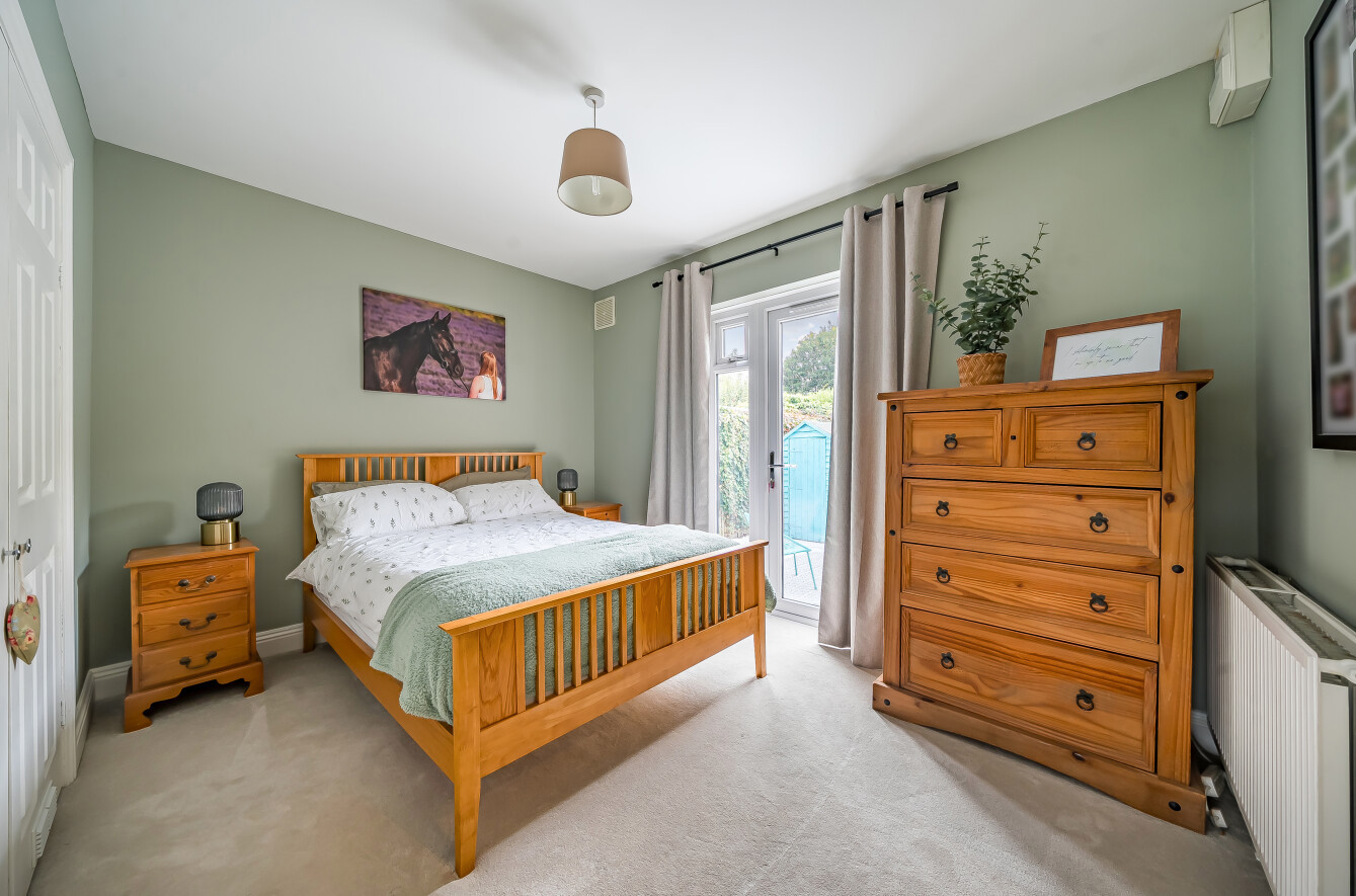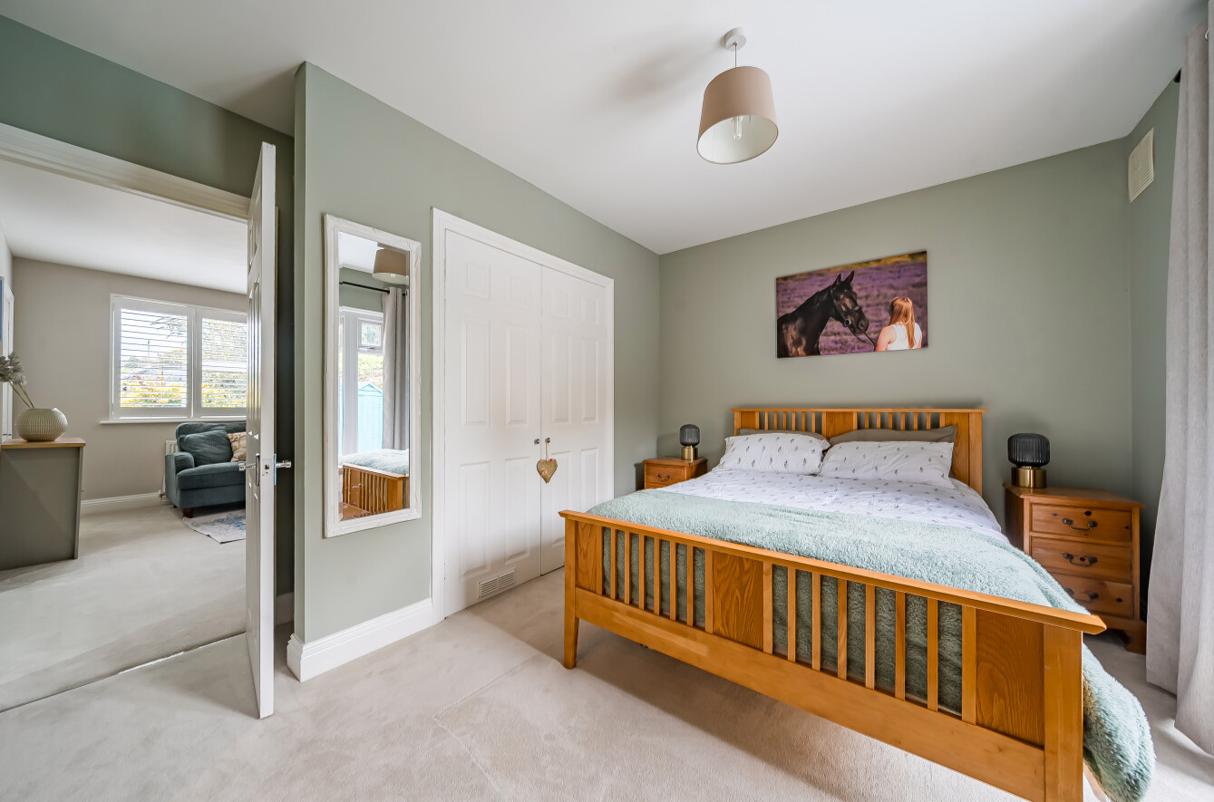 The double bedroom is situated at the rear of the property and includes a large built-in wardrobe and an ensuite bathroom, fitted with a bath and shower over, vanity unit with sink, and a WC with built-in cistern.