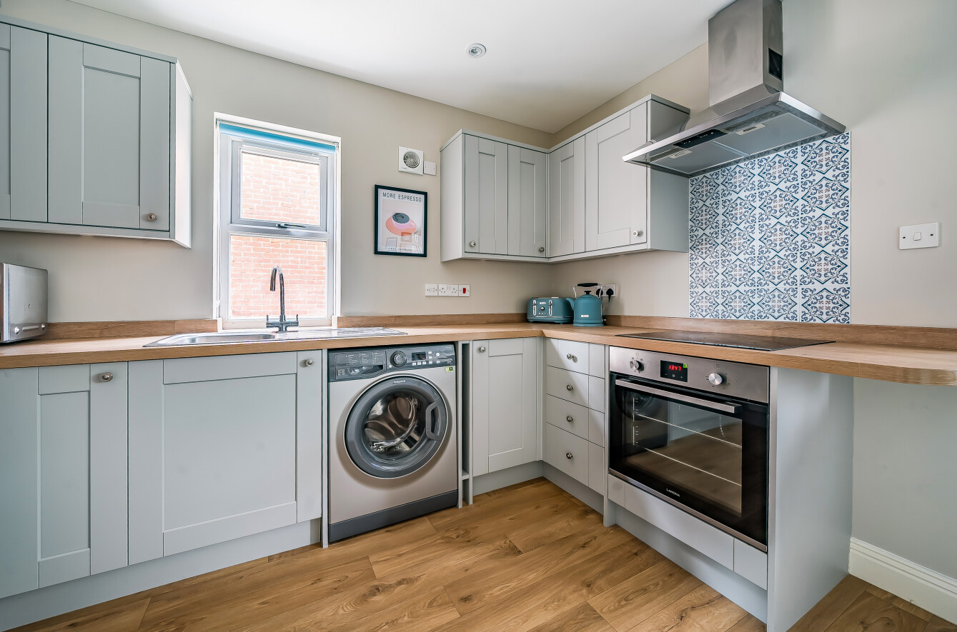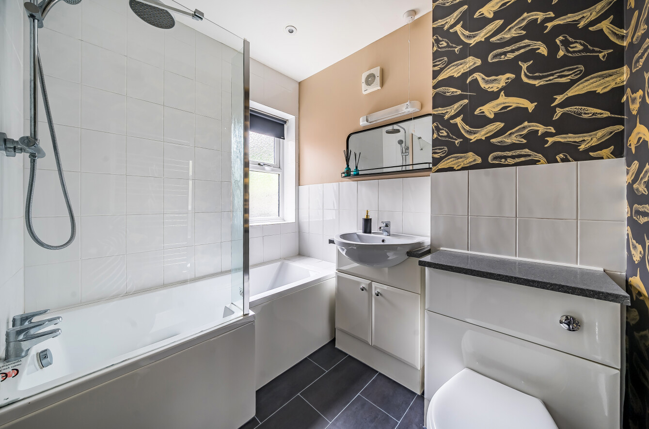 Open plan to the sitting room, the recently refitted kitchen provides a stylish and practical space with an electric oven, hob, and extractor fan. There is a generous range of units with wood-effect worktops, plus space for a tall freestanding fridge and washing machine.