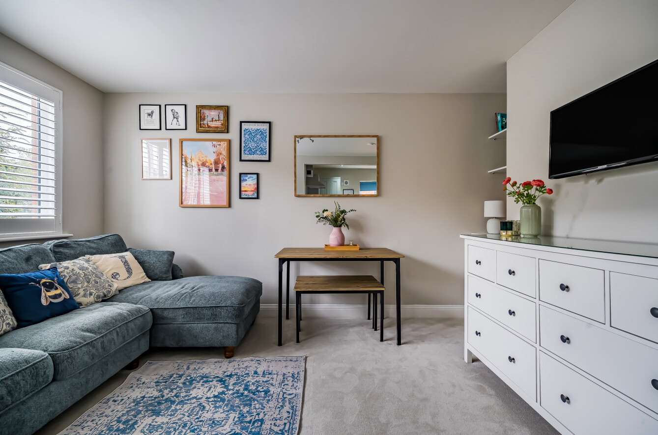 Forming part of a small block of just two properties, the flat benefits from its own private entrance leading into a welcoming lobby with a large, fitted cupboard. A further door opens into the bright sitting room, which features a built-in cupboard, display shelving, and a window fitted with white louvered shutters offering a pleasant outlook.