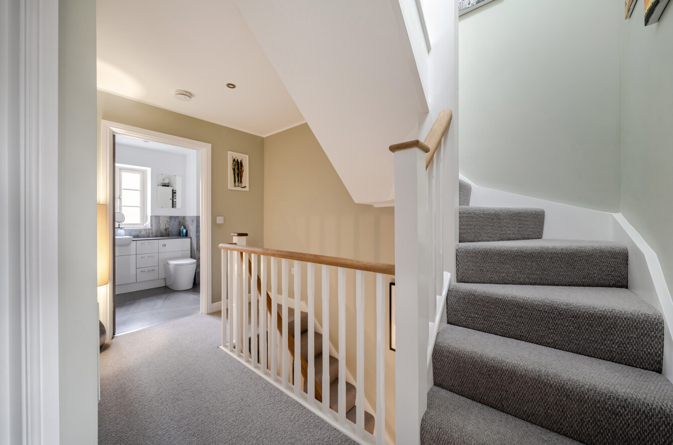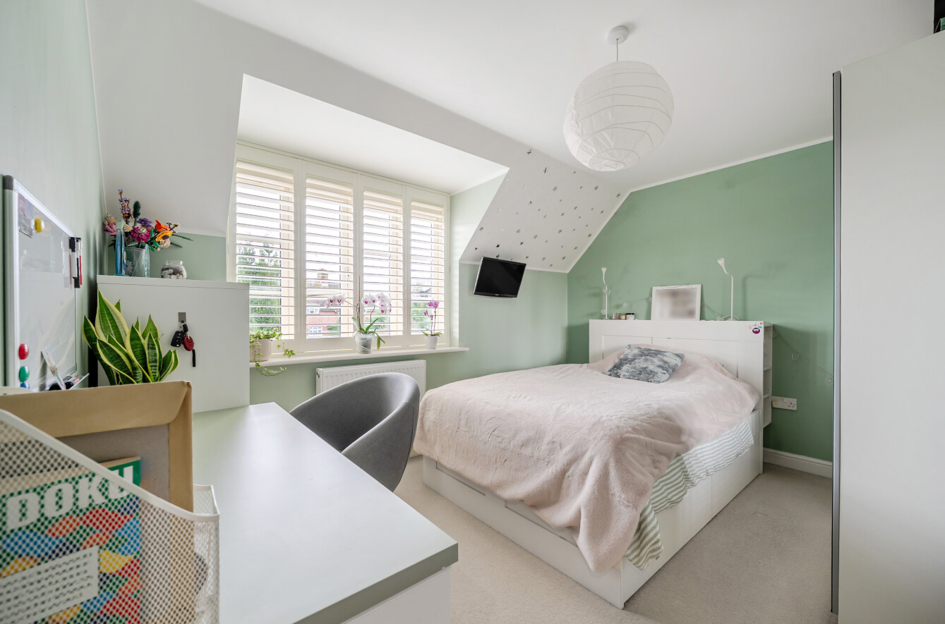 Upstairs on the first floor are three comfortable bedrooms, two of which are spacious doubles, while the third is a well-proportioned single room ideal for a child’s bedroom, nursery or study. The second floor reveals a charming double bedroom retreat, featuring built-in wardrobes and an abundance of natural light from both Velux and dormer windows.