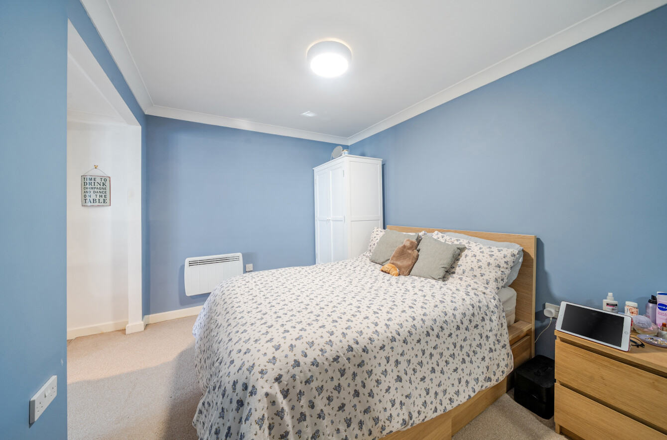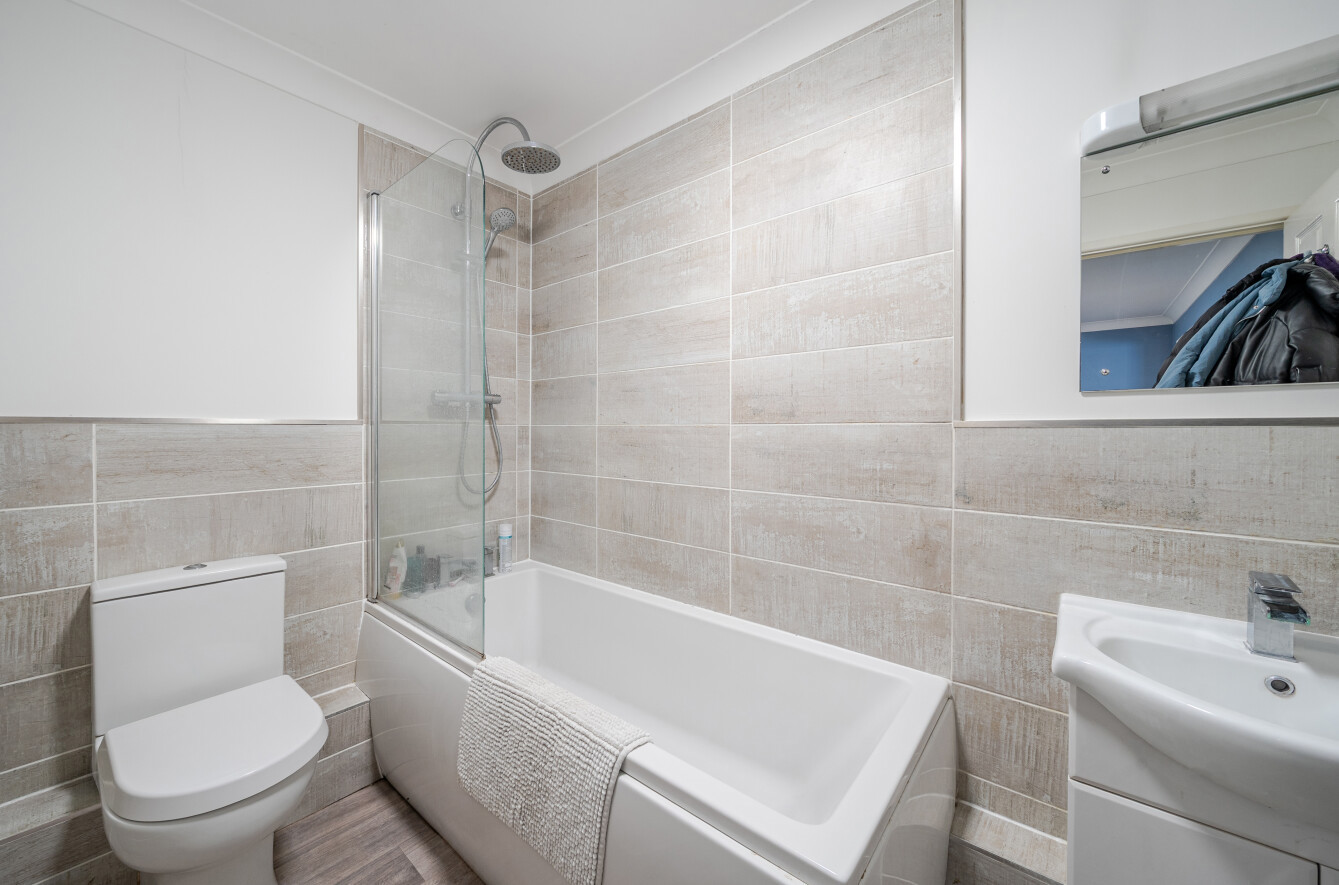 The generously sized double bedroom includes fitted wardrobes and additional storage options, and the contemporary bathroom is fitted with a white suite and a shower over the bath.