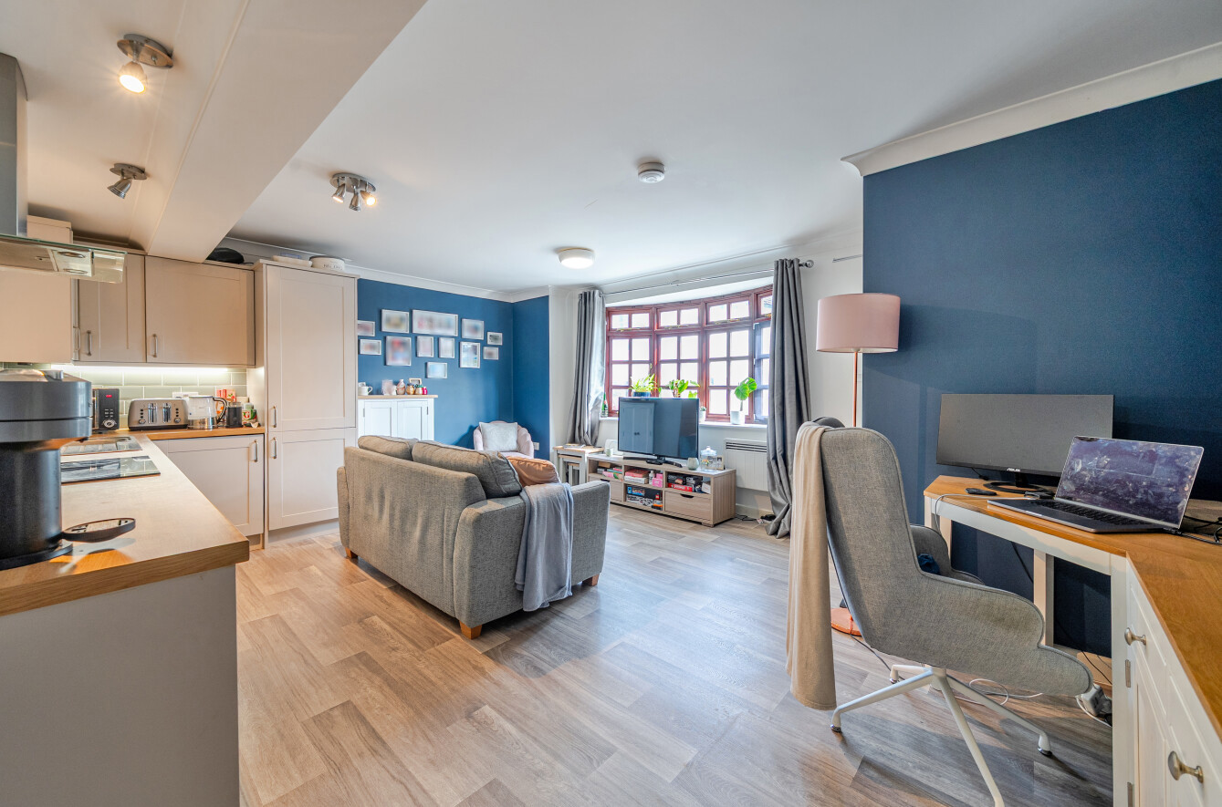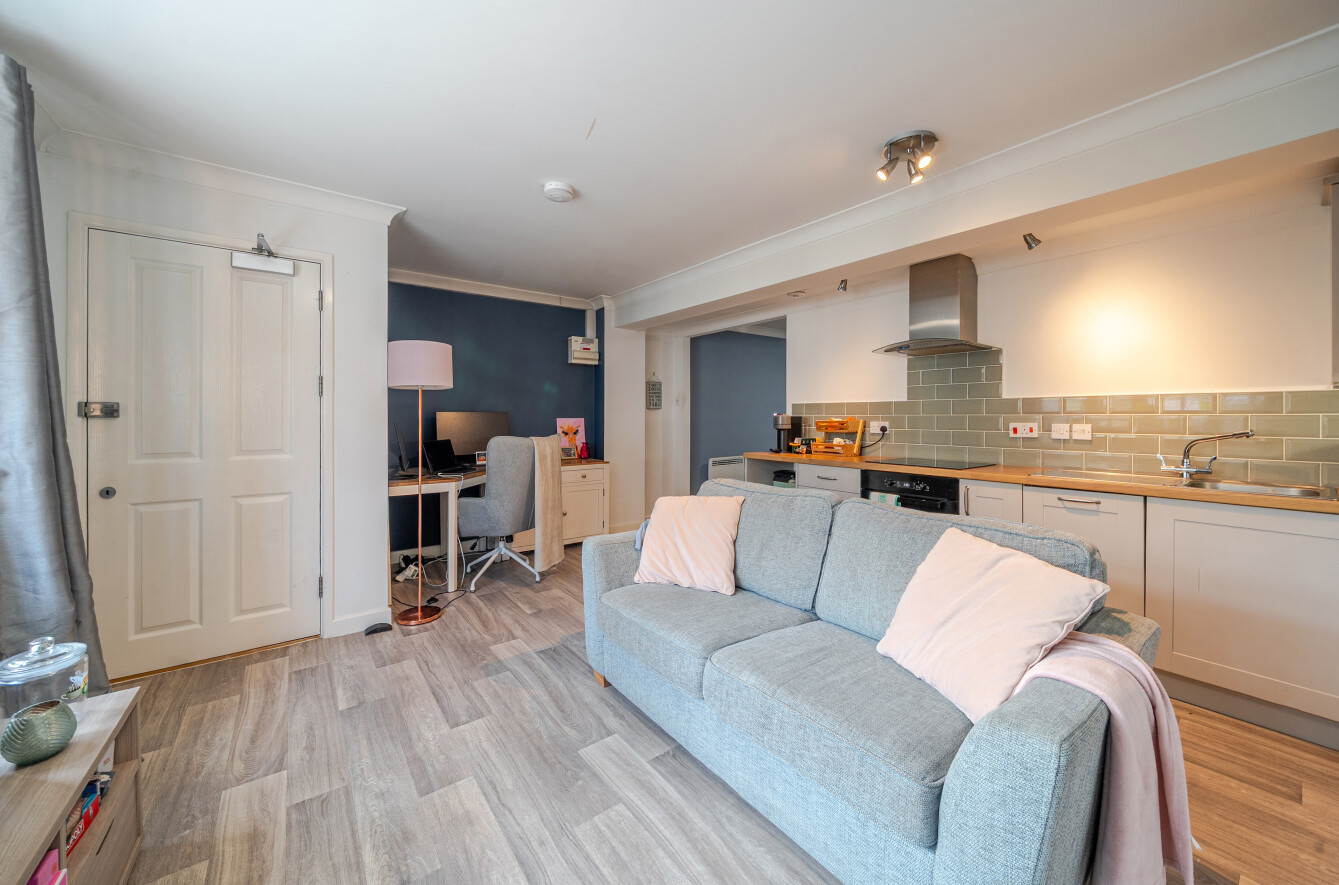 The property benefits from a private entrance leading into a welcoming vestibule, which opens into a bright and spacious open-plan living area. The fitted kitchen sits comfortably within the space, while a stunning bay window provides a perfect place to sit and enjoy the surroundings. There is also plenty of room for a dining area or home office, offering excellent versatility.