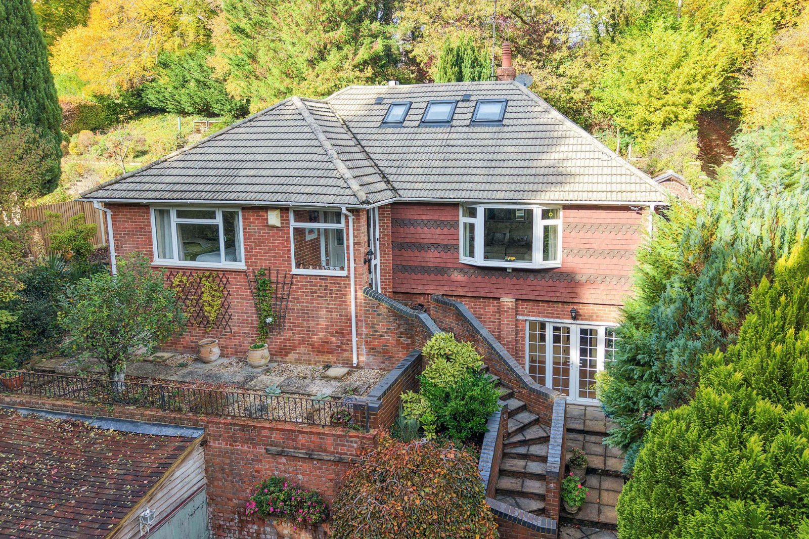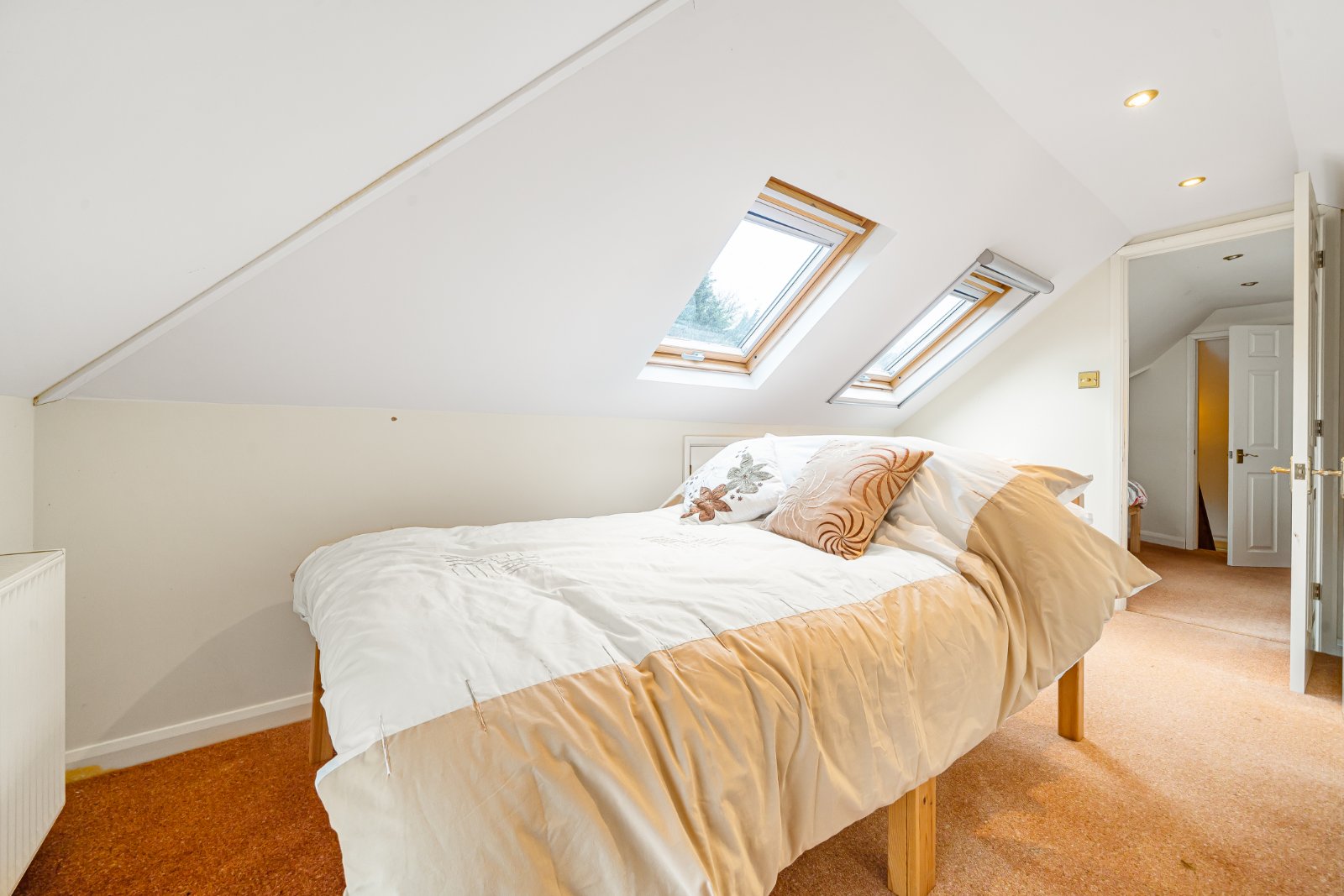The well-designed layout is ideal for modern family living. The kitchen/breakfast room features white units, wooden work surfaces, and a stable door leading to the conservatory. The dual-aspect sitting room is generously sized, with a charming bay window framing delightful woodland views. Two double bedrooms, both with built-in wardrobes, an en-suite shower room, and a family bathroom complete the main floor.