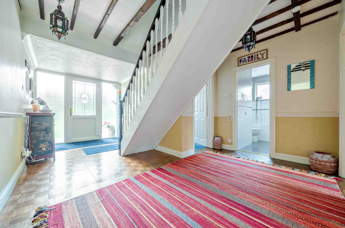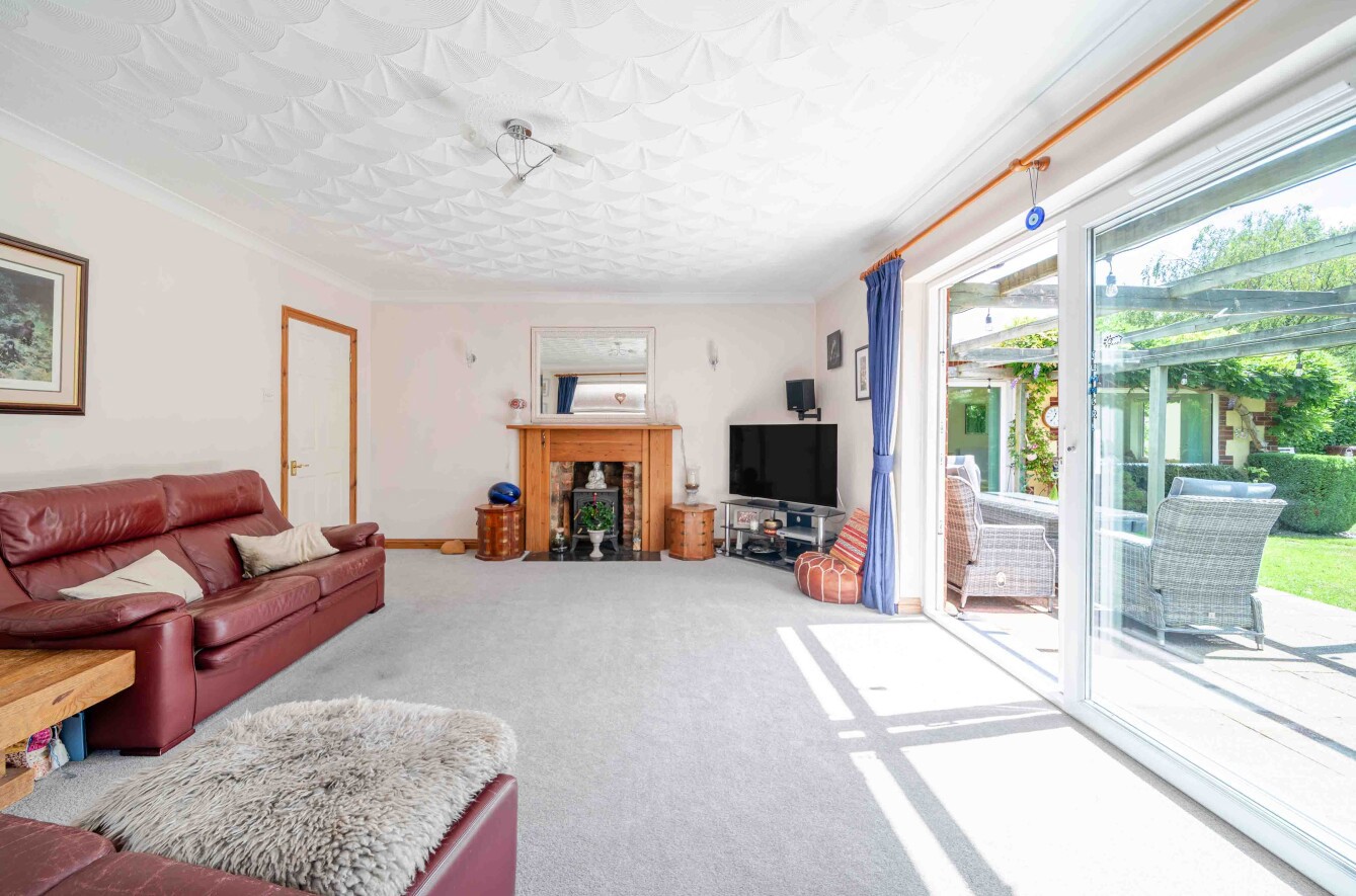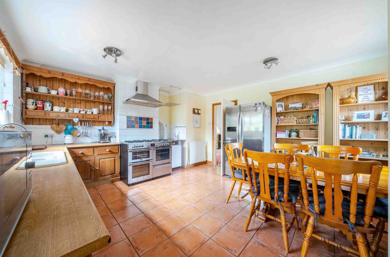 Inside, the residence has been well maintained and updated with many features. At its heart lies a large kitchen/breakfast room measuring approximately 18’ x 16’, with plenty of cupboard storage, worktops and fitted appliances. This spacious, dual-aspect room provides access to both sides of the property and is perfectly suited to family gatherings. The main living room, with its generous proportions and characterful fire, provides a great space for entertaining or relaxing.