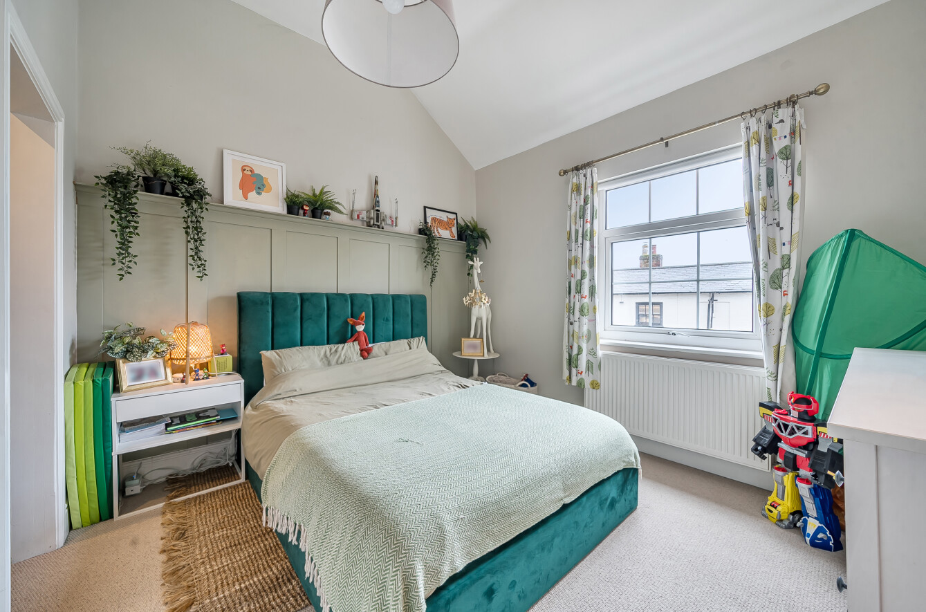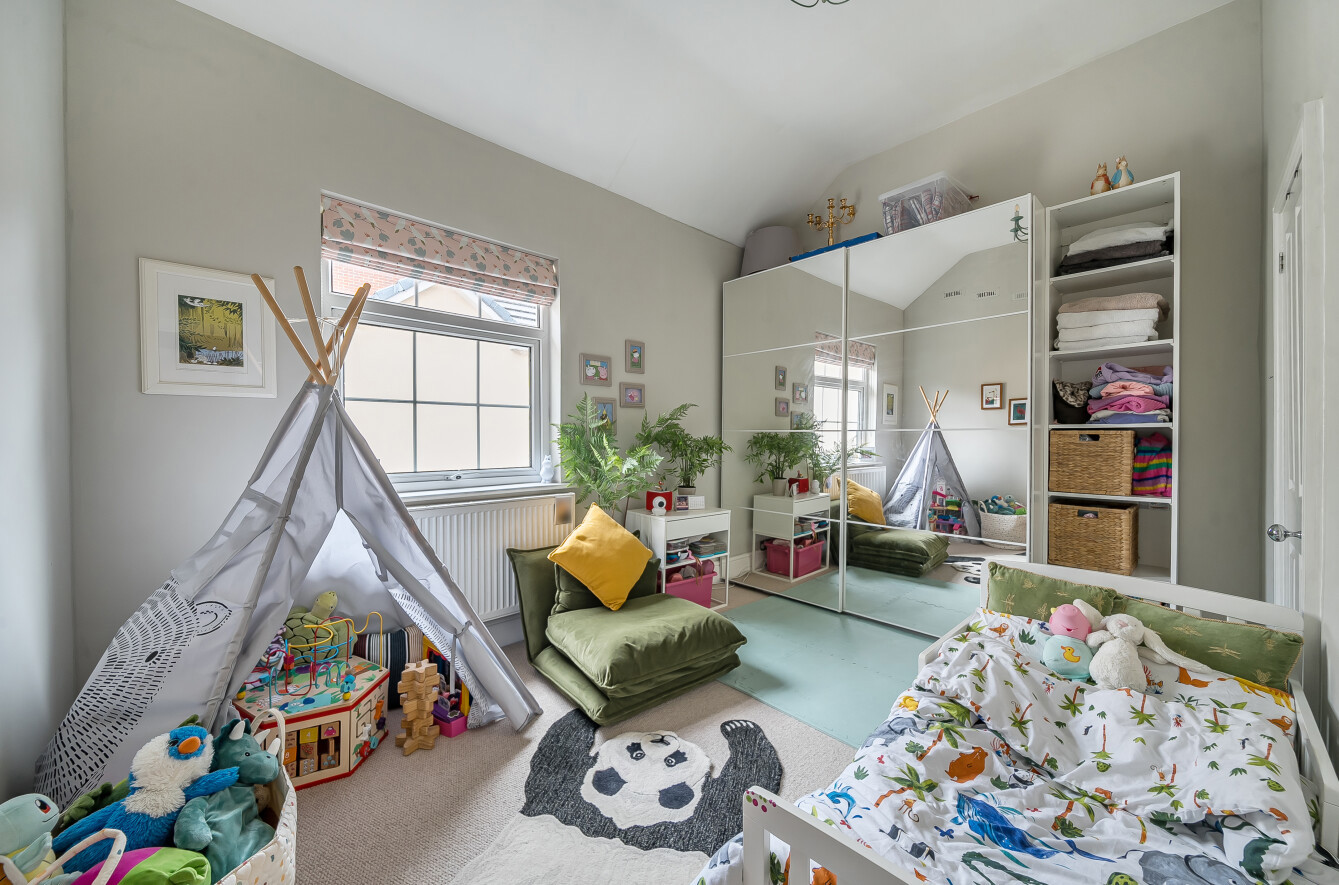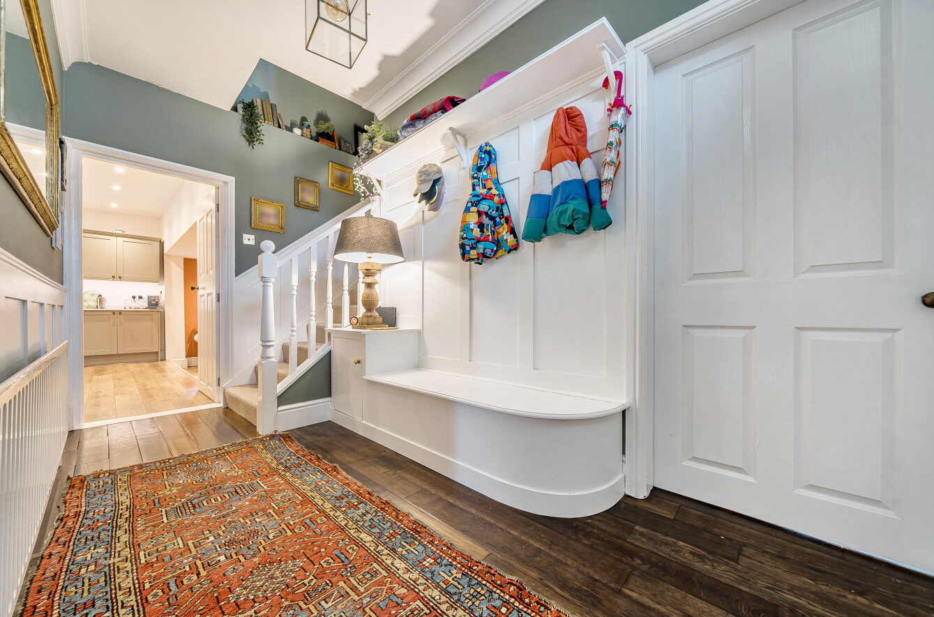 Ascending the staircase reveals the home's substantial upper level, featuring four bedrooms. Three of these are of a generous size, all enjoying the high ceilings characteristic of the period. Guests or family will appreciate the luxury of the second bedroom's stylish en-suite, while the remaining rooms are served by a beautifully well-appointed family bathroom.