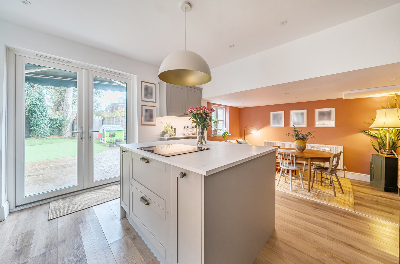 The undeniable heart of the home lies to the rear: a beautifully executed kitchen/breakfast room. It boasts classic Shaker-style cabinetry, a striking central island, opening into a welcoming, sunken dining/snug area. This space, designed for both everyday life and grand entertaining, opens directly onto the rear garden via French doors.