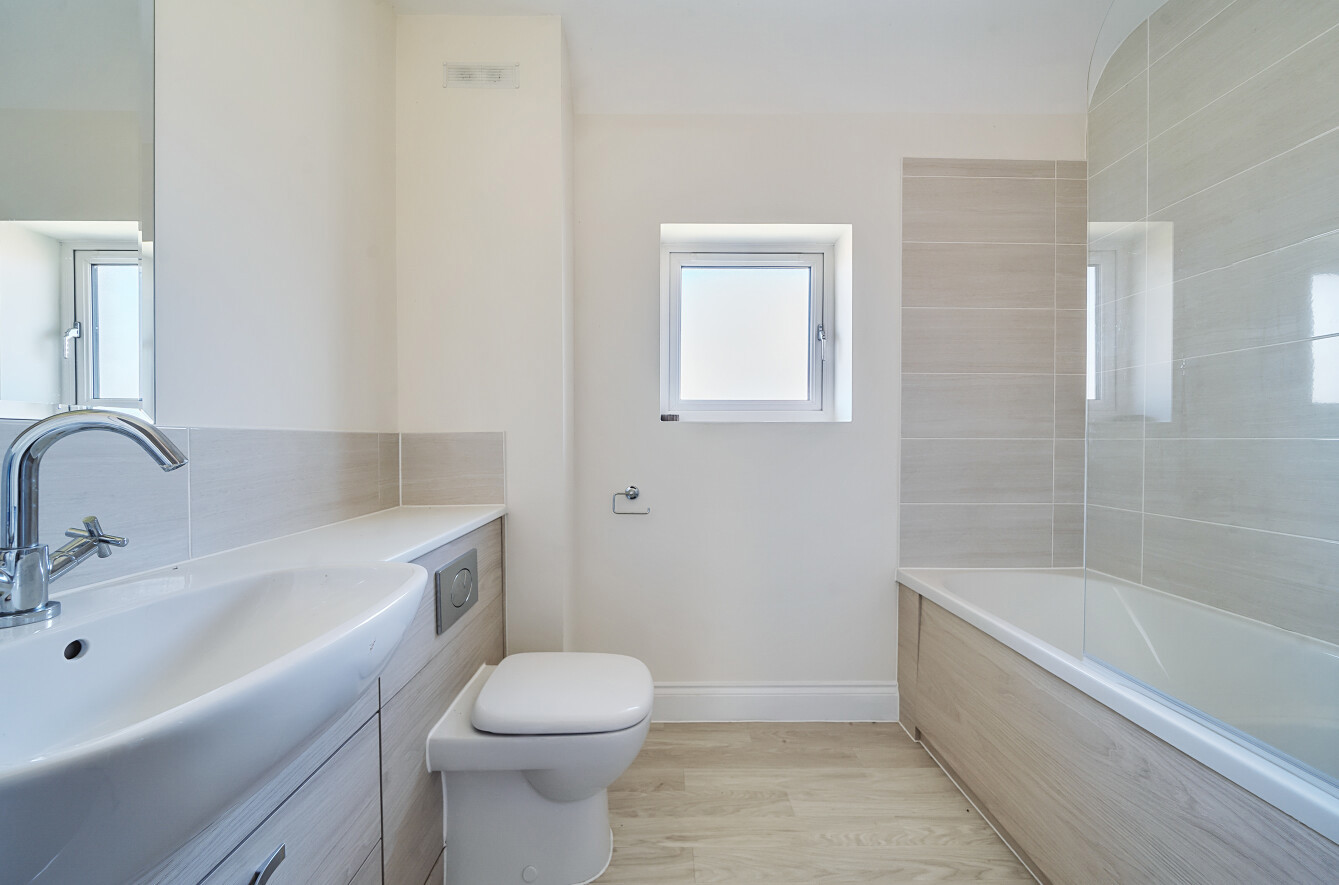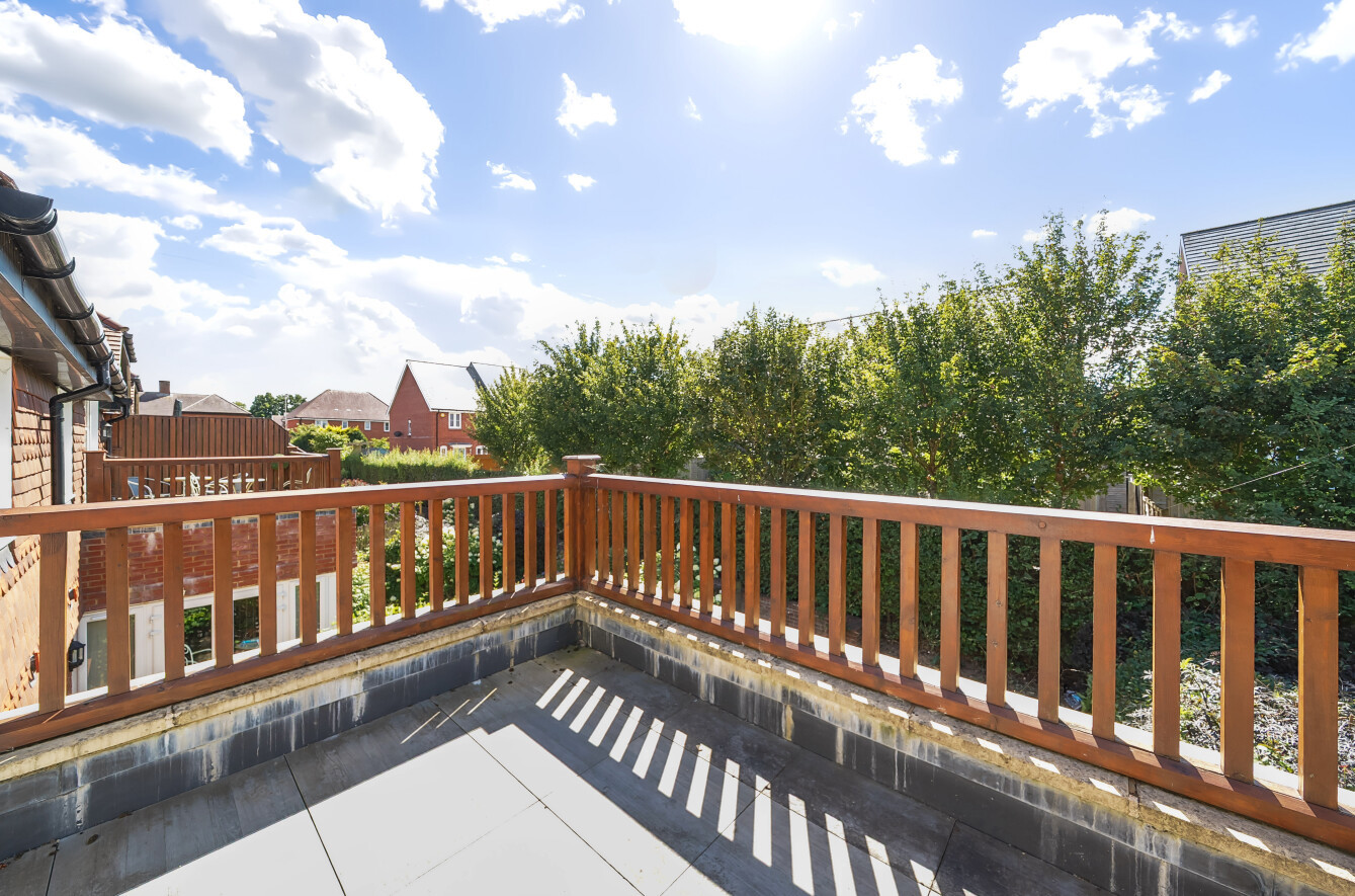 Upstairs, there are three bedrooms — two doubles and a single — each with built-in wardrobes. The principal bedroom enjoys its own en-suite shower room and a private balcony with far-reaching views. A stylish family bathroom serves the remaining rooms.