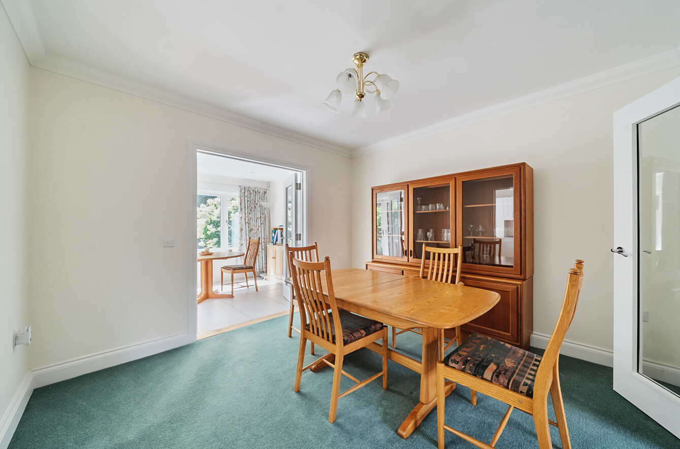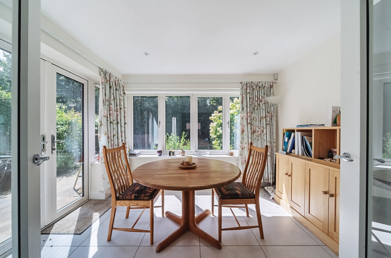 The ground floor is thoughtfully arranged, with a generous sitting room centred around a feature fireplace, and a separate dining room that opens into a bright sun-room overlooking the garden. The kitchen is modern and well-equipped, with integrated appliances and plenty of storage. A large cloakroom with fitted cupboards and understairs space completes the downstairs layout.