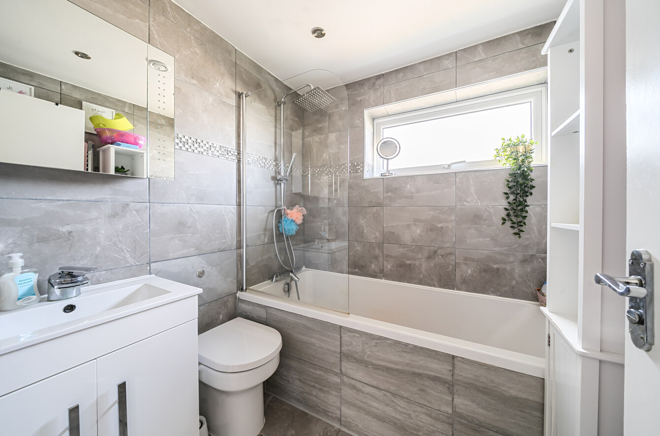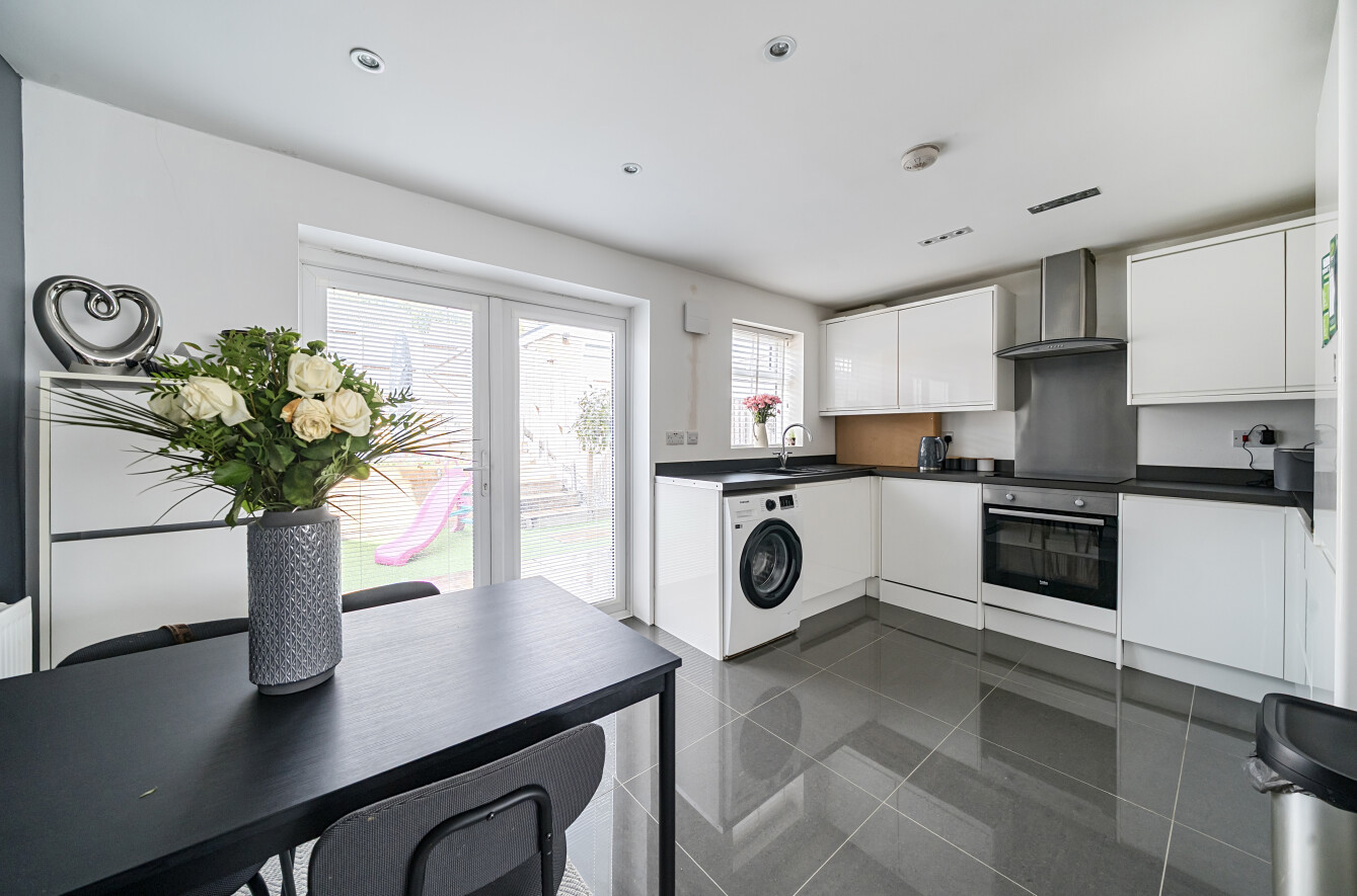 Upstairs, the first floor hosts three well-proportioned bedrooms alongside a sleek and contemporary family bathroom.