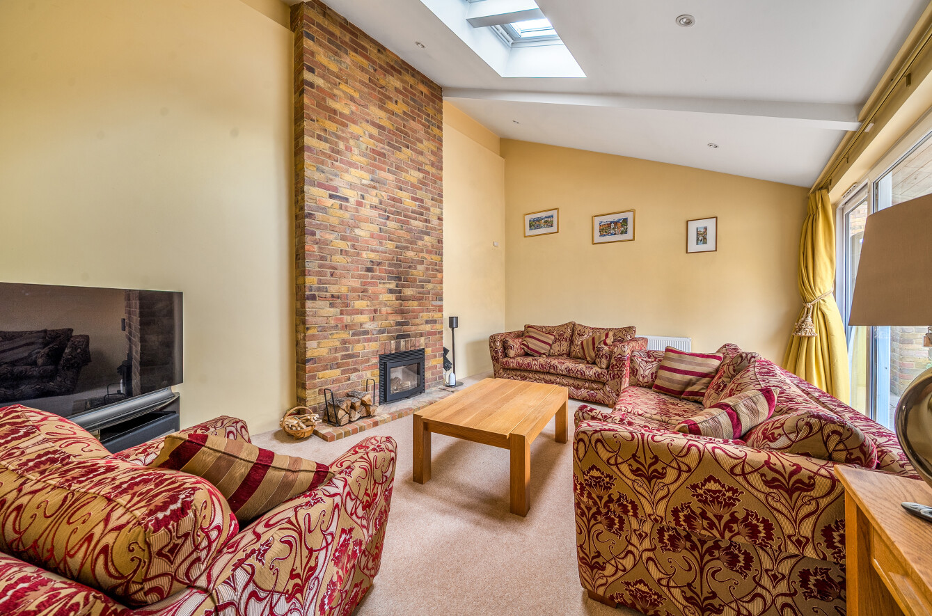 The reception and entertainment areas begin to the left side of the property, anchored by a stunning, high-end 23’ x 20’ kitchen and dining room. This hub of the home features a central island preparation area and enjoys dual aspects to the front and rear, flooding the space with natural light. Complementing this is a contemporary sitting room, defined by a feature fireplace and a striking high-pitched vaulted ceiling that adds a sense of volume and grandeur.
