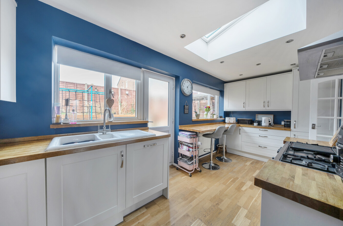 To the rear, the property has been thoughtfully extended to provide an impressive open-plan kitchen/breakfast room. Featuring a breakfast bar ideal for socialising and entertaining, this wonderful space also offers pleasant views over the sunny rear garden. The kitchen is fitted with a range of wall and base units, complemented by generous worktop space to cater for all your culinary needs. A separate utility room adds practicality and keeps household tasks neatly tucked away.