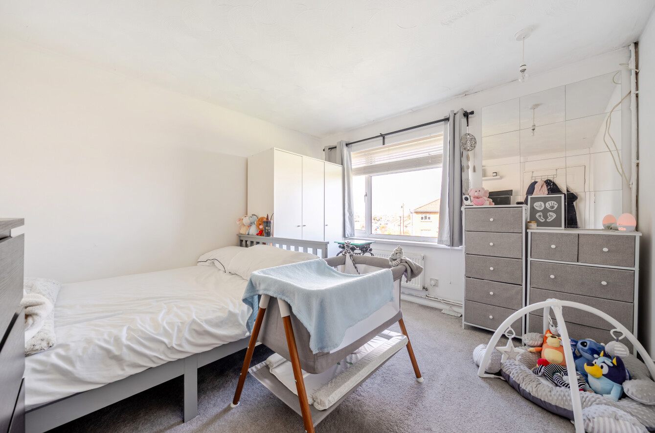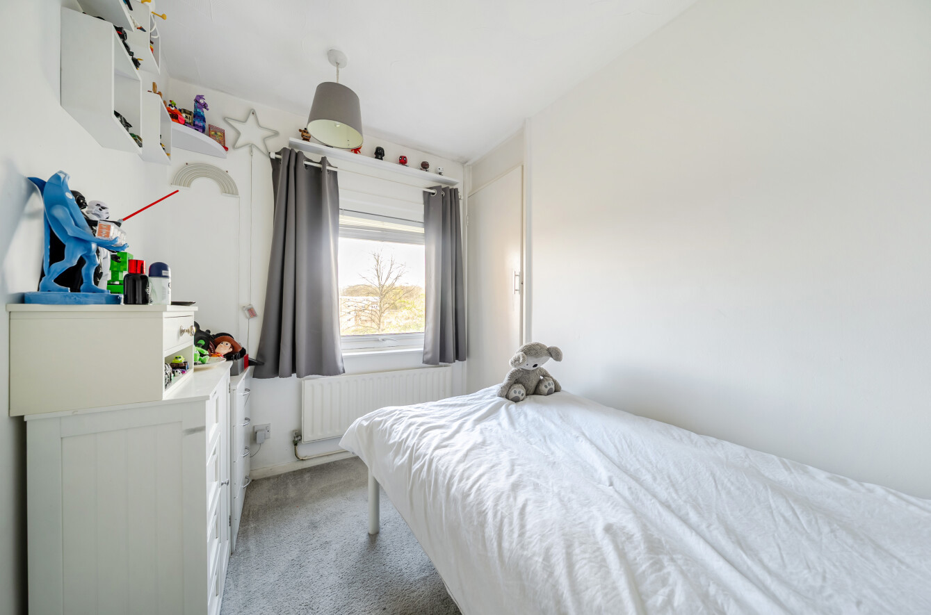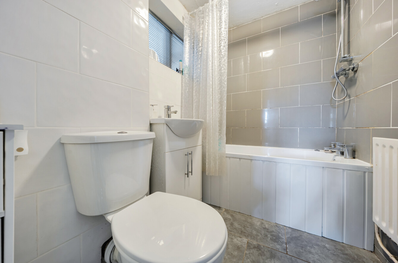 The principal bedroom is filled with natural light, creating a warm retreat, and benefits from double built-in wardrobes, while the second bedroom also features built-in storage. Both bedrooms are served by a three-piece family bathroom, complete with grey tiled walls and a shower over the bath.