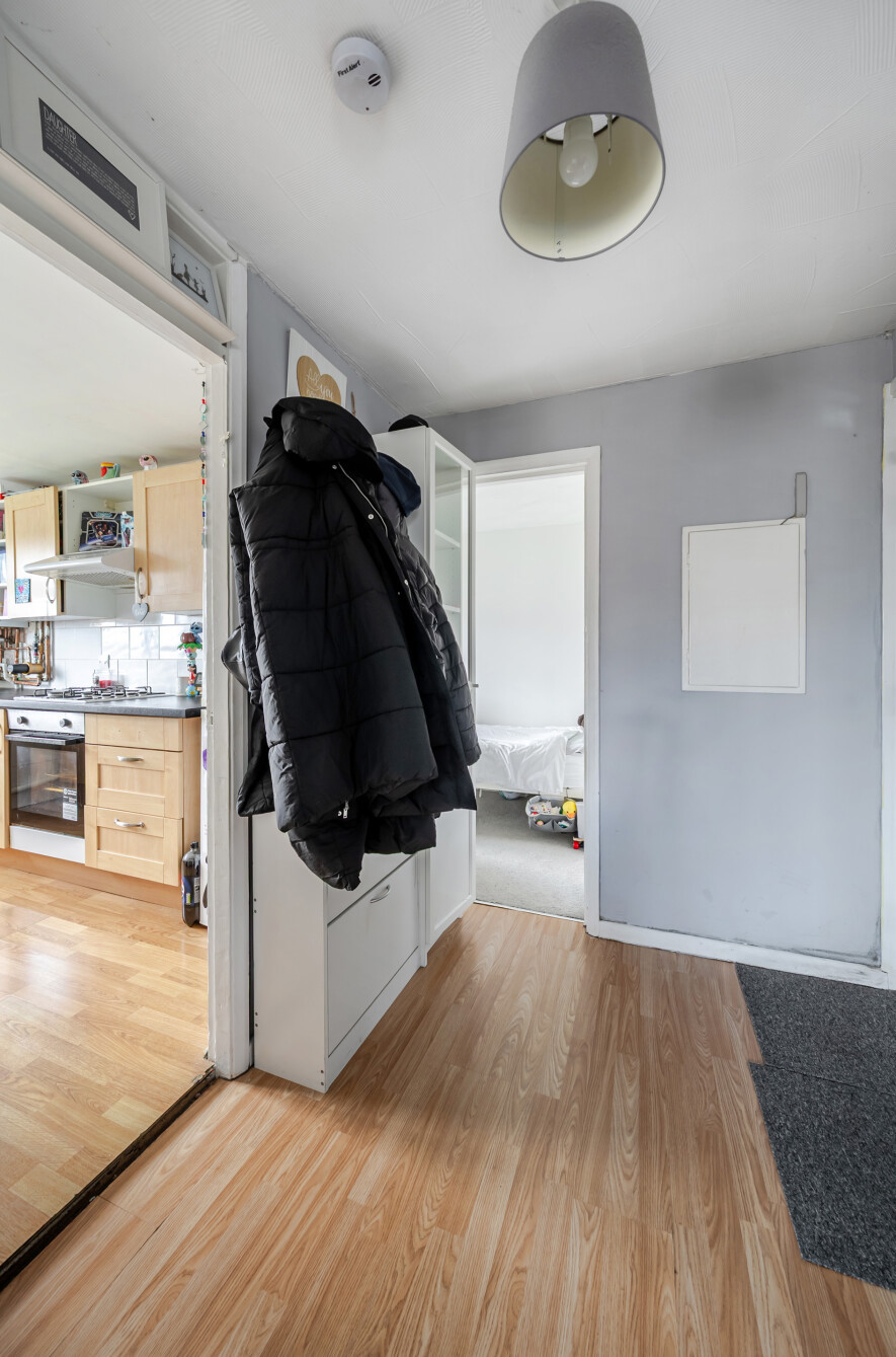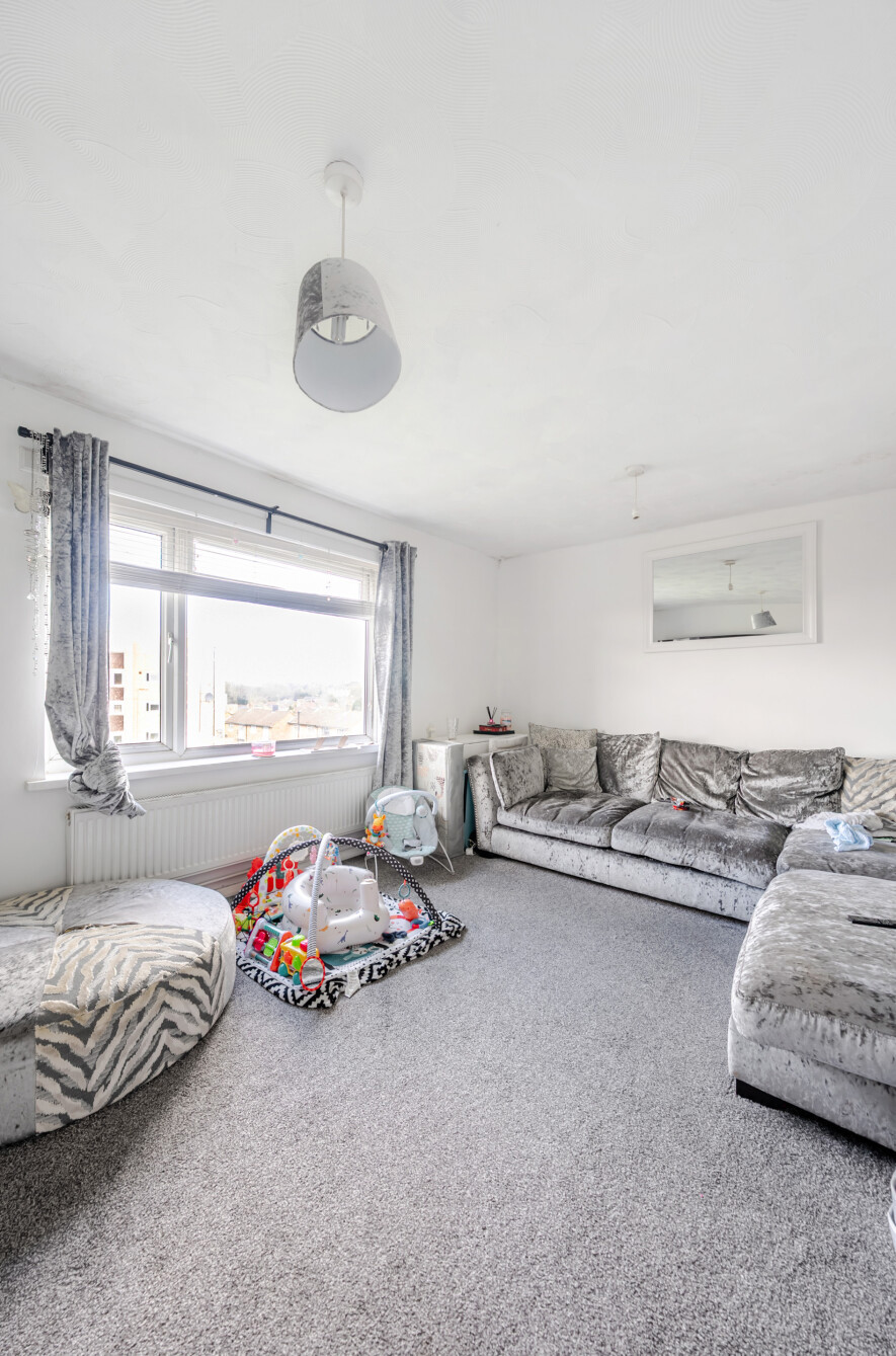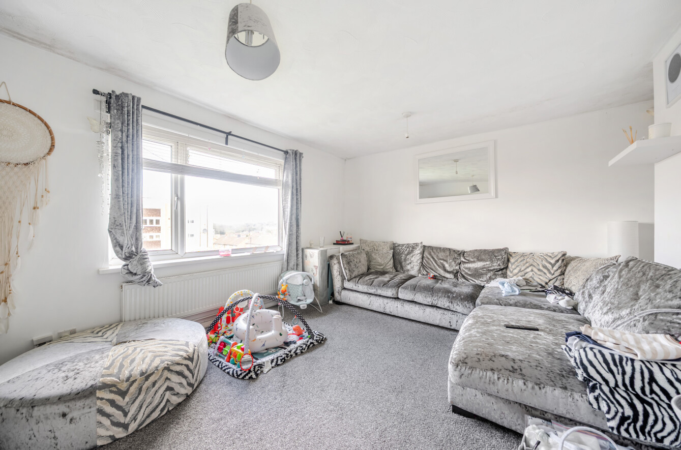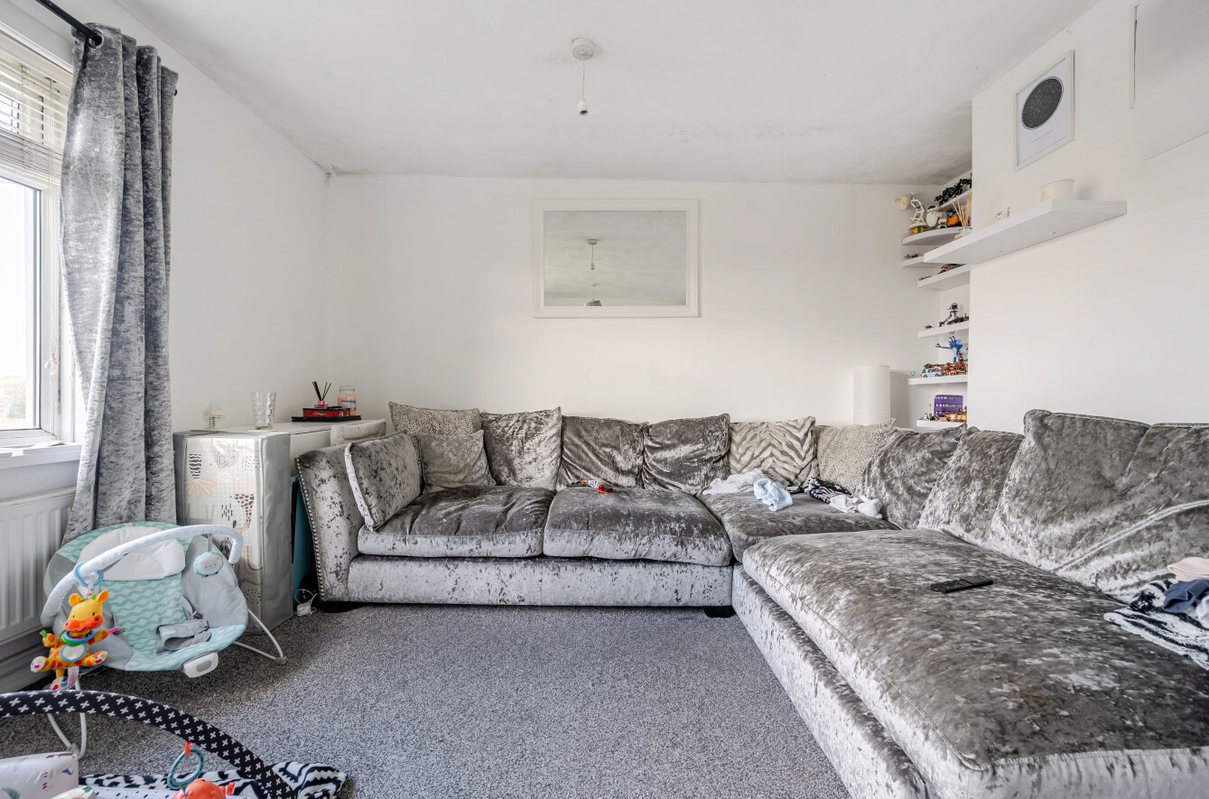 The principal bedroom is filled with natural light, creating a warm retreat, and benefits from double built-in wardrobes, while the second bedroom also features built-in storage. Both bedrooms are served by a three-piece family bathroom, complete with grey tiled walls and a shower over the bath.