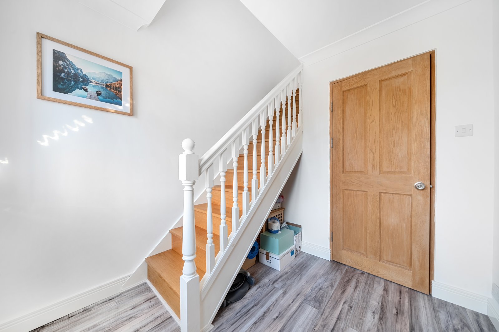 The curved bay window in the lounge/dining room allows ample natural light into this family space enhancing the bright decor and light wood laminate flooring. The kitchen is fitted with white storage cabinets to eye and base level with matching work surfaces. There is a built-in oven and hob with extractor fan above and the sink and drainer unit is located beside the window with an additional understairs storage cupboard to the side.