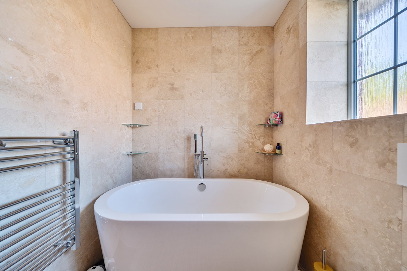 On the first floor you have two bedrooms both of which have wood laminate flooring. The family bathroom has a curved suite comprising a free-standing bath, a wall mounted sink and oval wall hung toilet with hidden cistern.