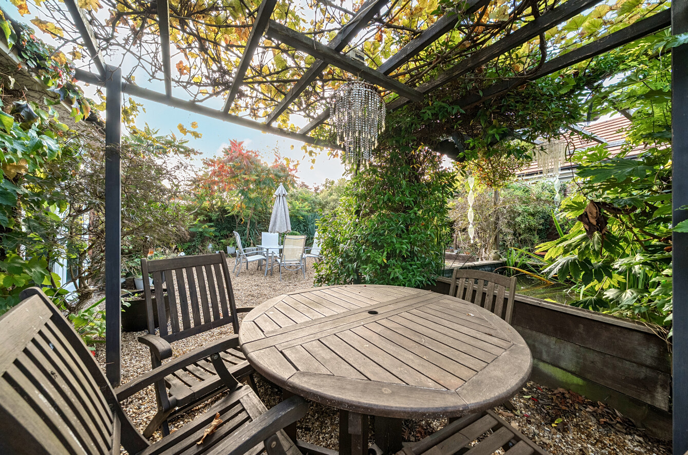 There are three well-proportioned bedrooms, with the principal bedroom enjoying French doors that open directly onto the rear garden, offering a lovely outlook and easy access to outdoor space. The bathroom is fitted with a traditional white suite, complementing the property’s stylish yet timeless presentation.