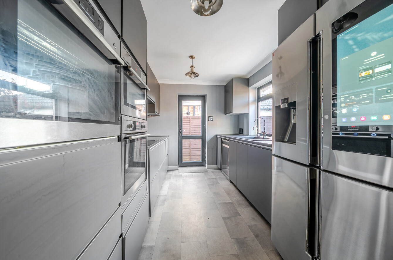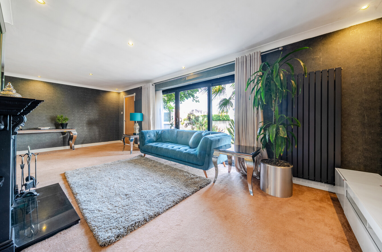 A welcoming entrance leads into the impressive 23'9" L-shaped sitting and dining room, a bright and spacious living area featuring a striking fireplace and ample space for both relaxation and entertaining. The sleek modern kitchen is fitted with a comprehensive range of units and built-in ovens, combining practicality with a refined, contemporary design.