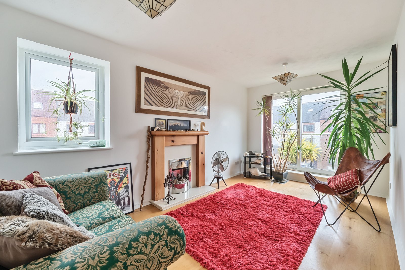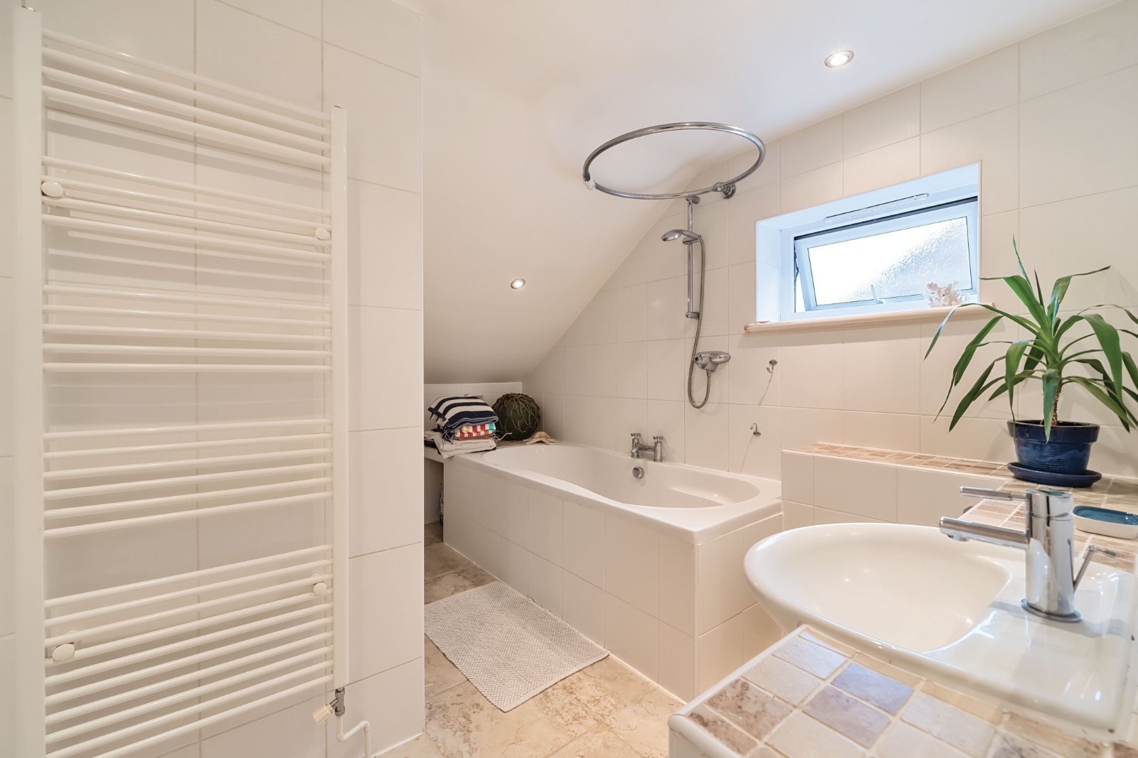The upper floor features the master bedroom with dual-aspect windows and access to the private balcony. There is also the main bathroom, which includes a bath with shower over, wash-hand basin, WC, and heated towel rail.