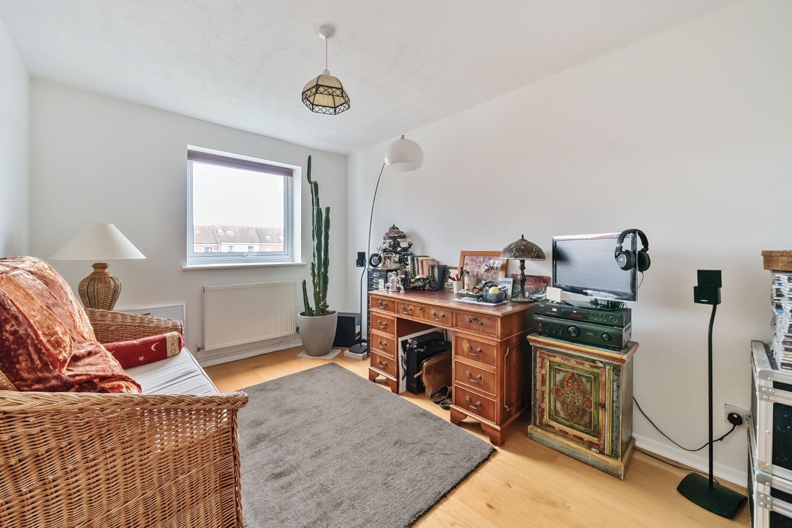 The lower floor of the maisonette comprises two double bedrooms, a lounge with dual-aspect windows and access to the first balcony, and a fitted kitchen with wall and base units, work surfaces, a stainless steel sink and drainer, an electric oven and hob, space for a fridge/freezer, and plumbing for a washing machine.