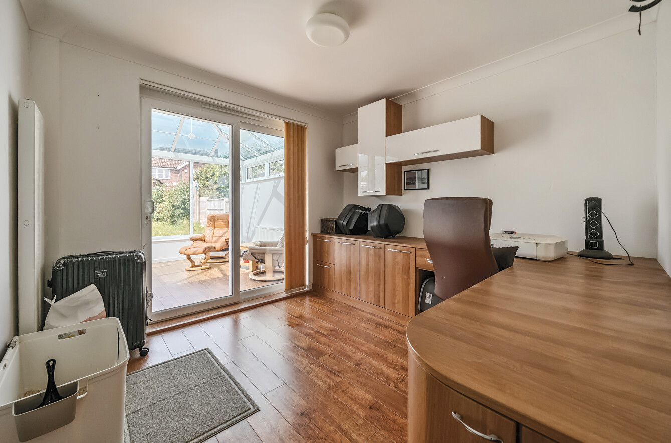 The home also features a modern family bathroom and two further bedrooms positioned at the back of the property. One of the bedrooms is currently used as a study, offering flexibility for home working or guest accommodation.