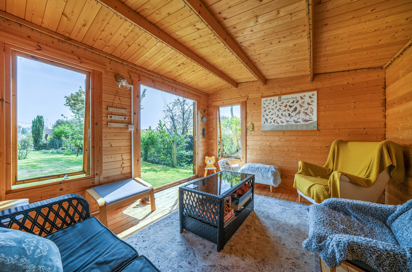 Externally the rear garden extends to over 180ft, sure to captivate nature enthusiasts and outdoor lovers alike. This lush, expansive garden provides a serene retreat, offering a perfect blend of manicured lawns, vibrant flower beds, and mature trees that create a picturesque backdrop for relaxation. Situated at the end of the garden is a versatile garden cabin, ideal as a garden bar, gym, office, or hobby space. Additionally there are two further outbuildings used as workshop/storage, or a further office space. A block paved driveway provides space for one vehicle at the front of the property.