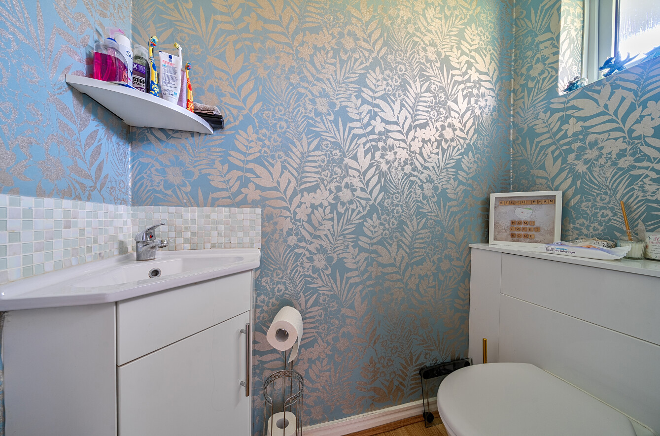 On the ground floor, a welcoming entrance hall sets the tone, complete with a convenient guest cloakroom. The stylish contemporary kitchen is fitted with a comprehensive range of wall and base units, generous work surfaces, and a single drainer sink unit with mixer tap, providing ample storage and preparation space. Just off the kitchen is a useful utility room along with a dedicated home office area — ideal for remote working or study.