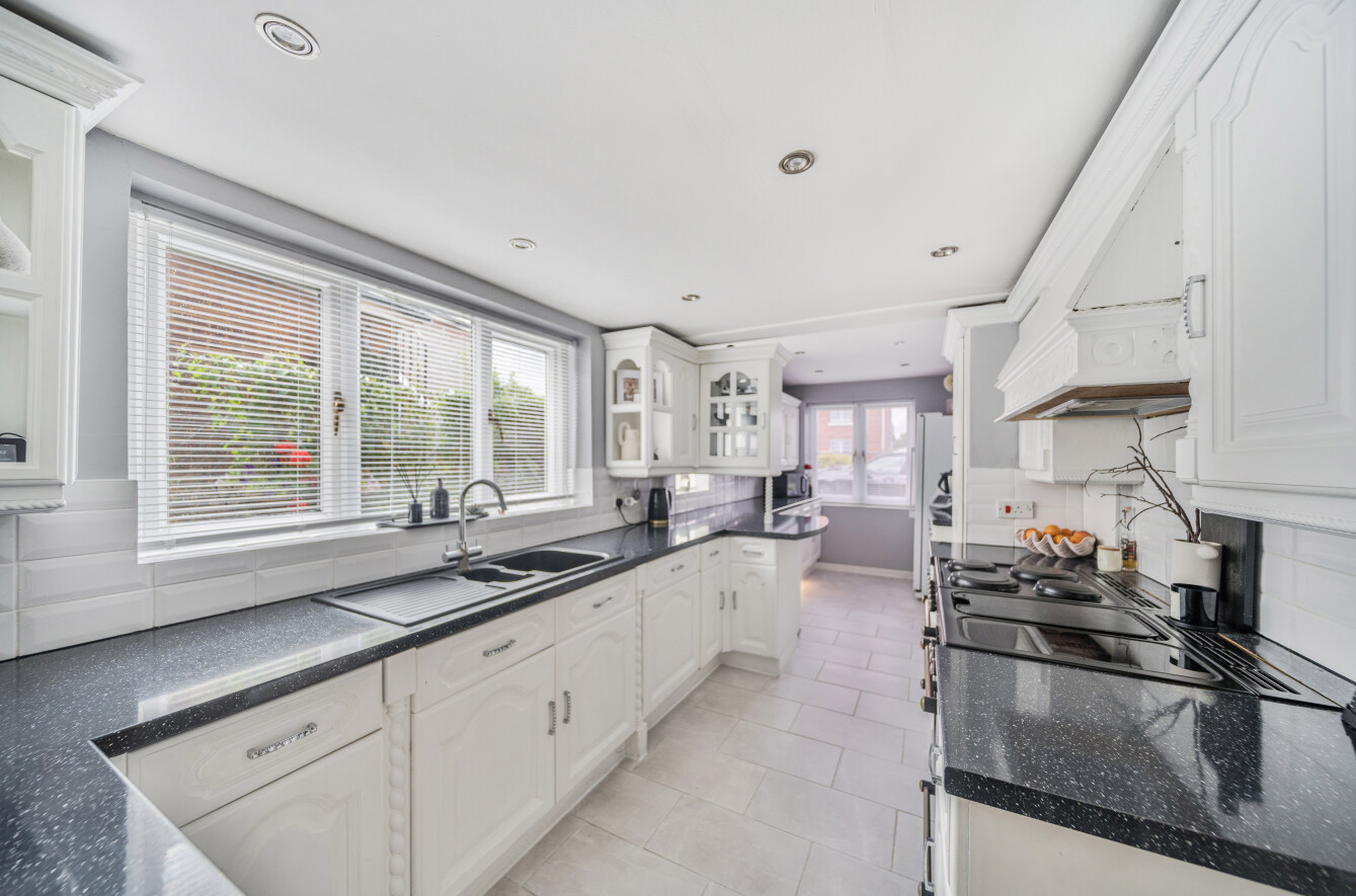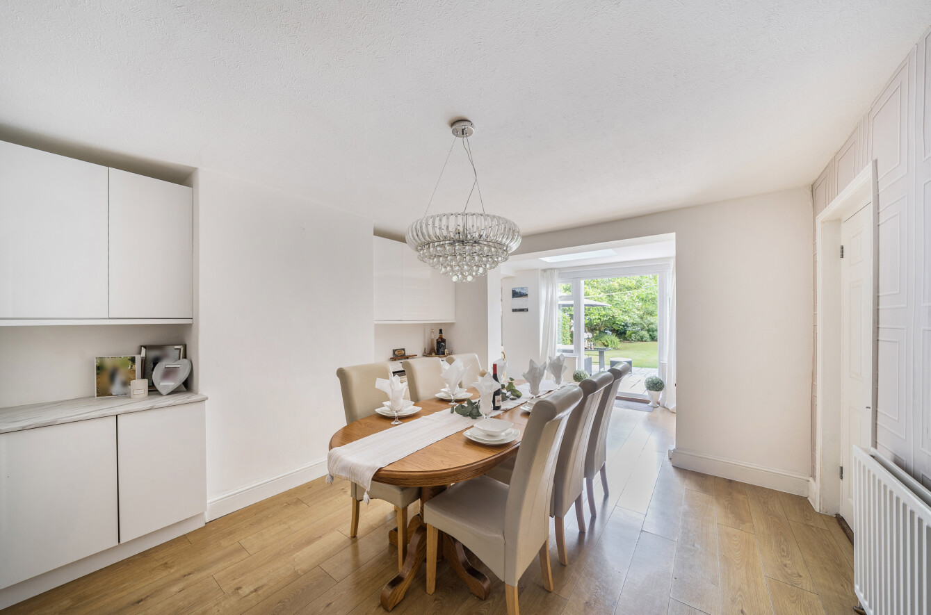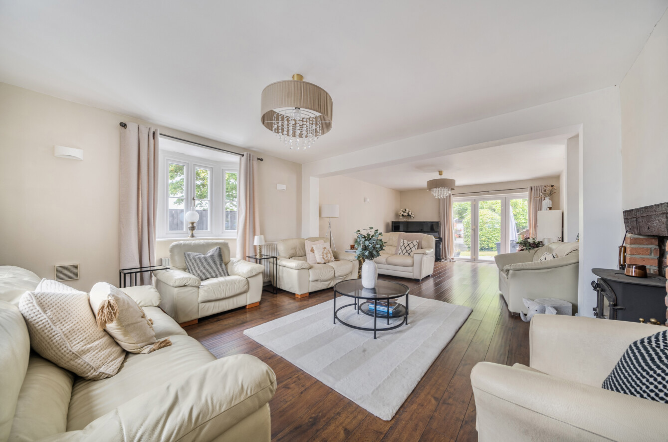 A welcoming entrance hall leads to the expansive sitting room which measures 28'3 x 14'1 and features a triple aspect, log burner and bi-fold doors to the rear garden. The fitted kitchen displays a good range of wall and base units with attractive work surfaces. A large utility room further complements the kitchen. There is a formal dining room, which is generous in size and has French doors to the garden. A convenient shower room completes the ground floor.