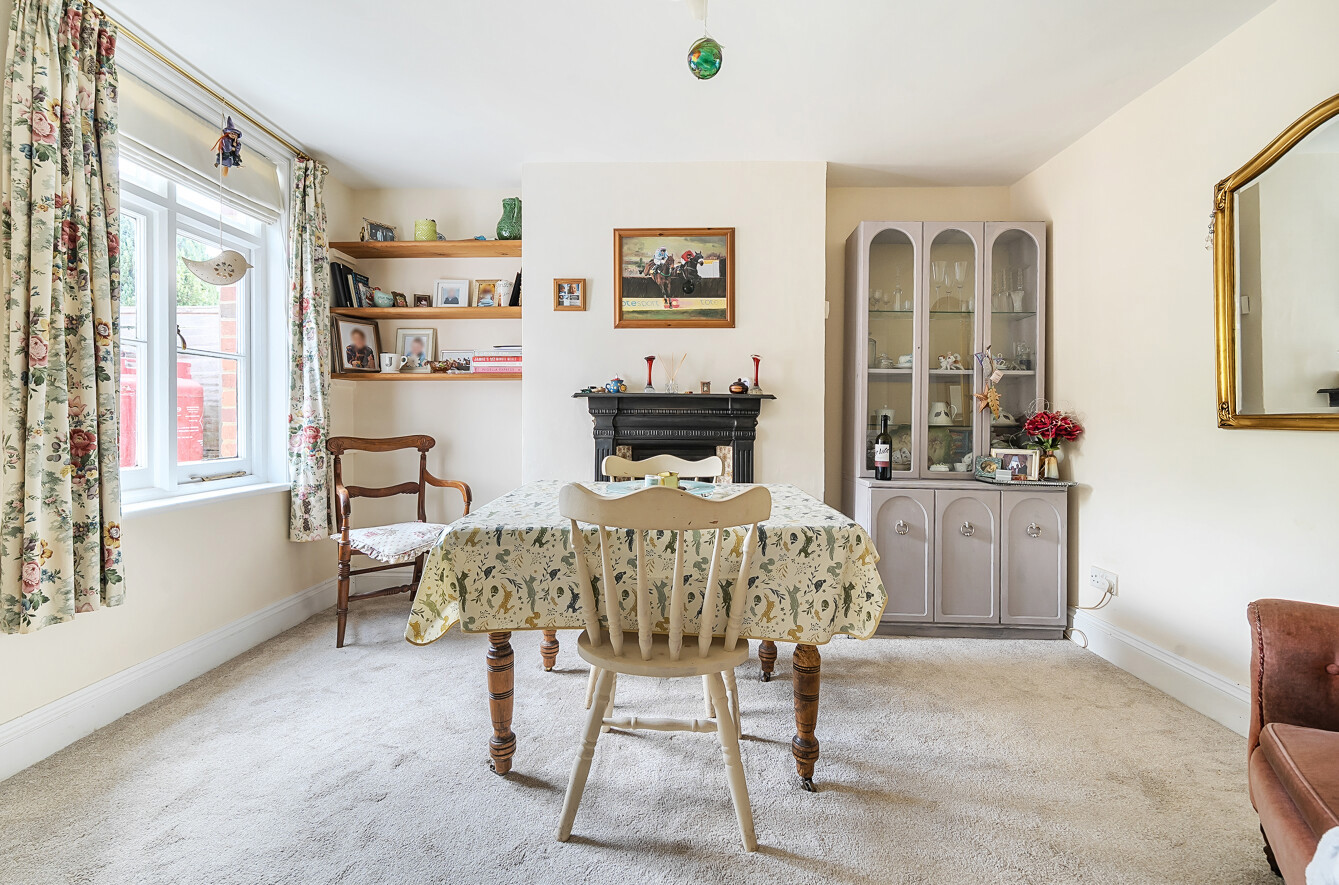 Accessed via a charming footpath lined with picture-perfect cottages and lovingly maintained front gardens. Upon entering, you are warmly welcomed into a bright and airy sitting room, where a characterful fireplace becomes the centrepiece of the space. This elegant room enjoys views over the mature front garden, bursting with greenery and seasonal colour. The flow of the home continues into a spacious and versatile dining room—another beautifully proportioned room complete with its own fireplace—making it the ideal setting for family gatherings and entertaining guests.