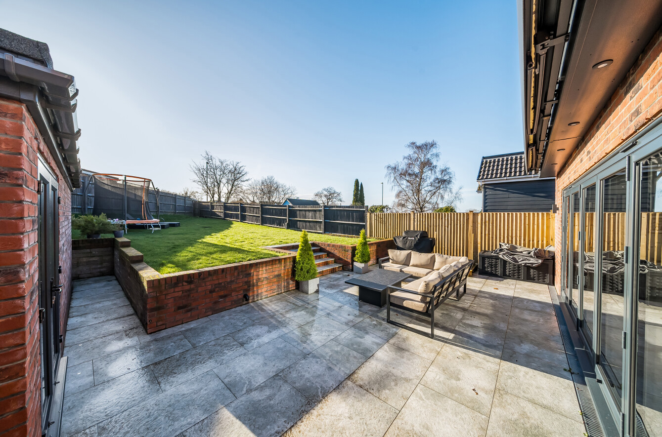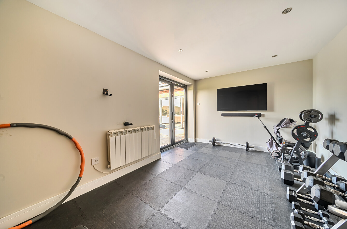 An outbuilding, currently used as a gym, offers versatility as it could easily be converted into an office or garden bar to suit your needs.