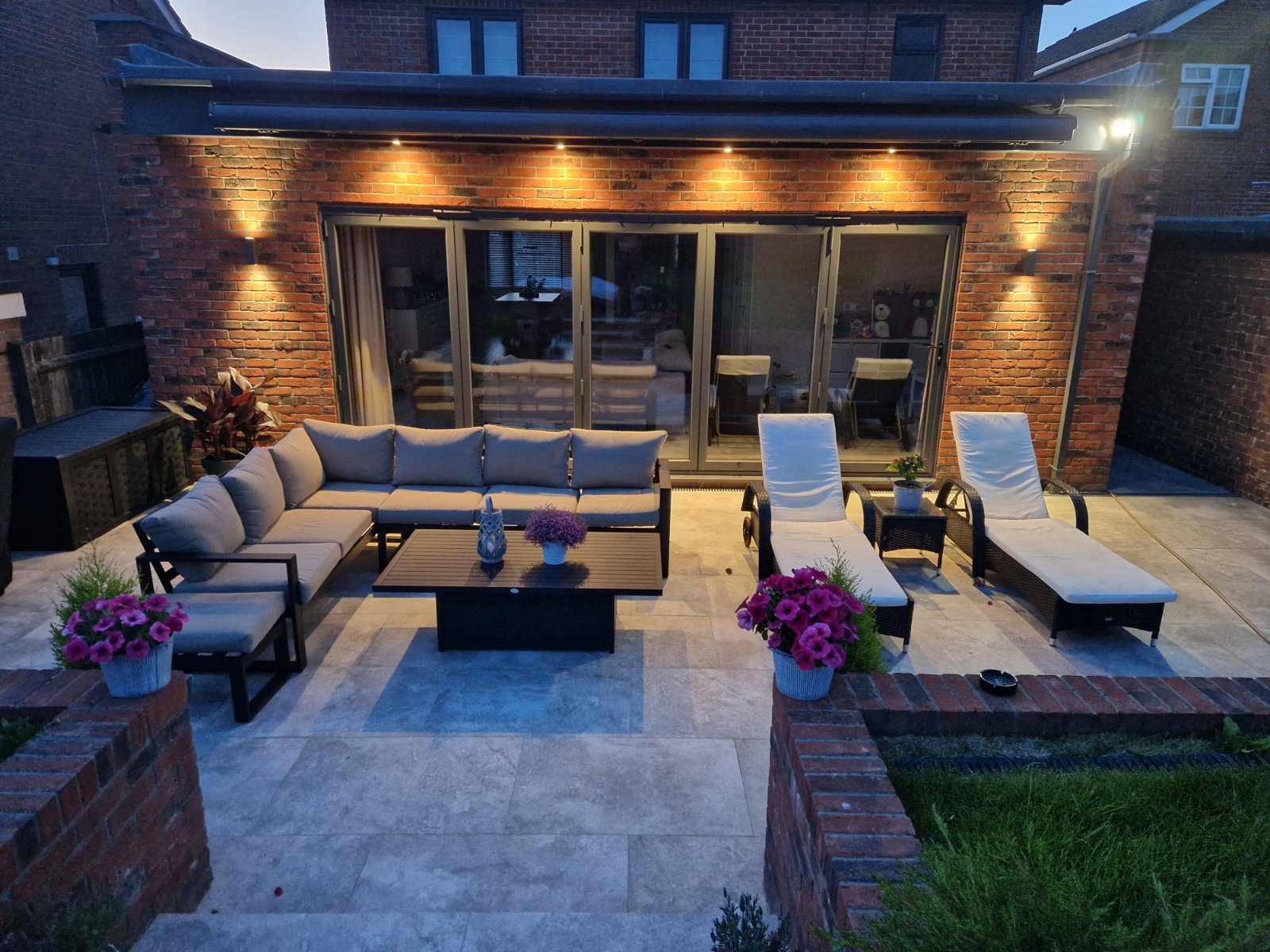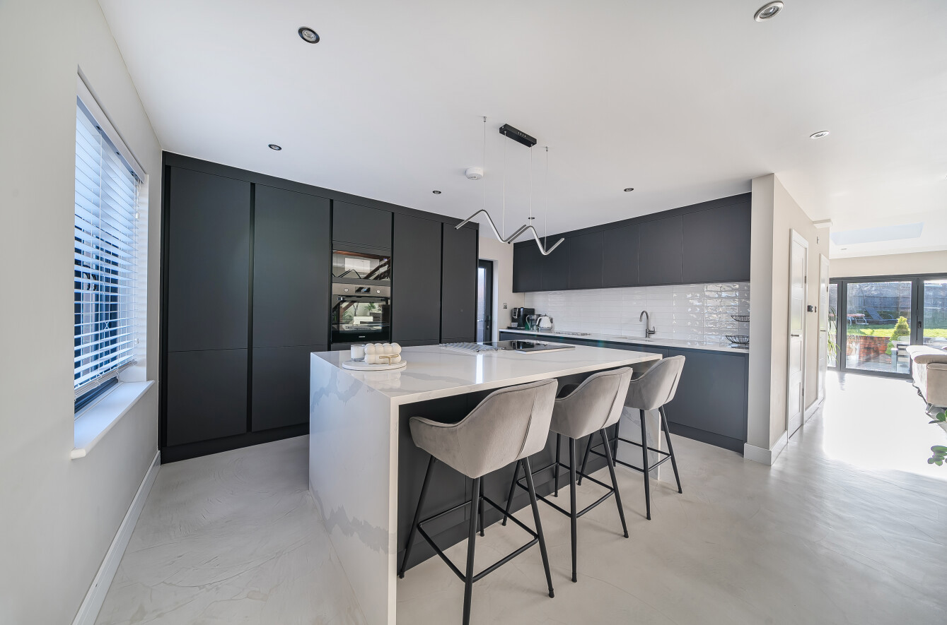 The sleek kitchen features stylish units and a central island, perfect for entertaining guests and family breakfasts. In addition, there is a separate utility room for added convenience. The property also boasts a good-sized rear garden, providing ample outdoor space for relaxation and recreation, including a patio area and motorized awning.