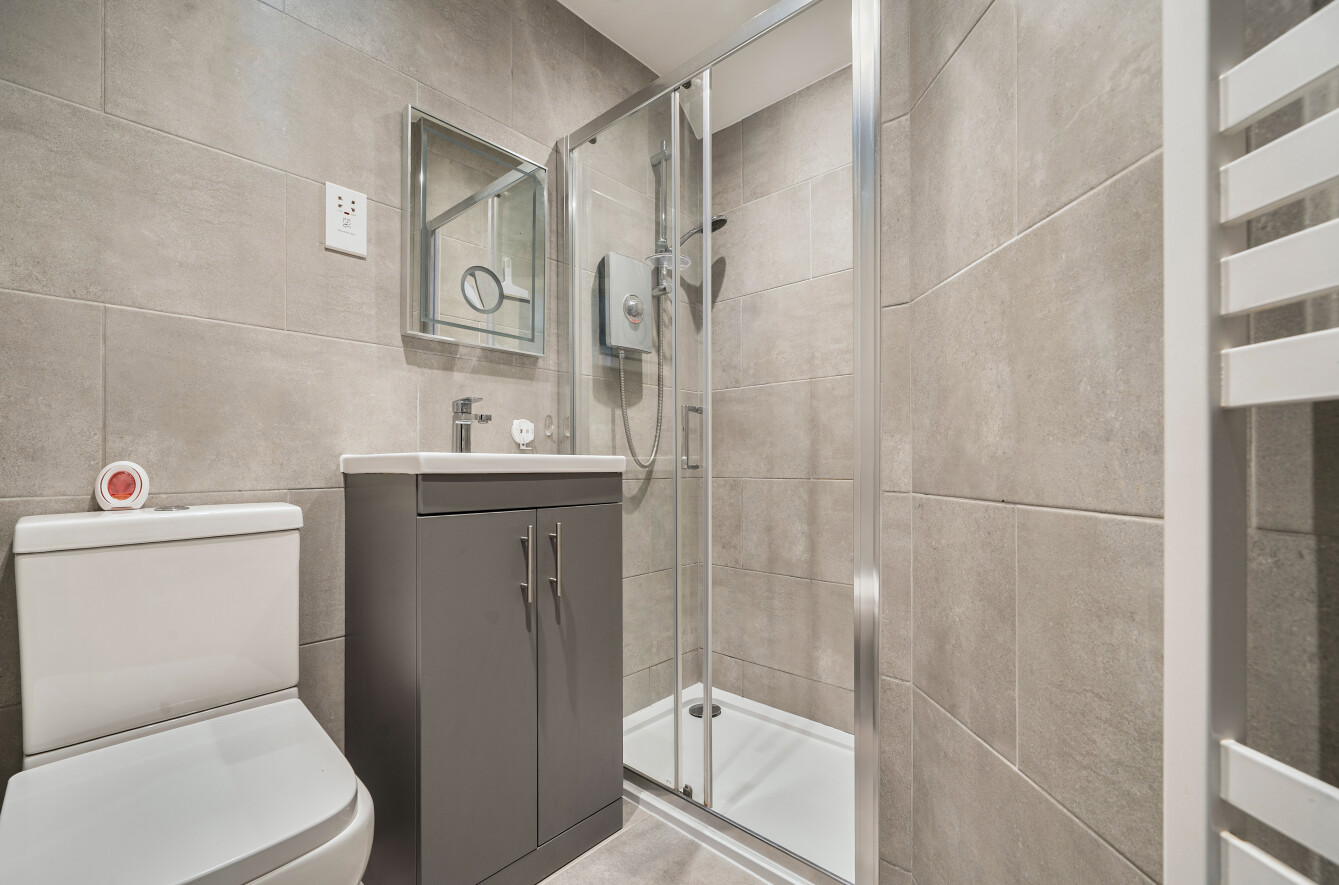 The apartment offers a well-proportioned double bedroom, complemented by a modern shower room finished with sleek tiling and quality fittings. An attractive and durable herringbone oak-effect vinyl flooring runs through the main living space and kitchen, with soft carpet in the bedroom and tiled flooring in the shower room, creating a cohesive yet comfortable feel throughout.