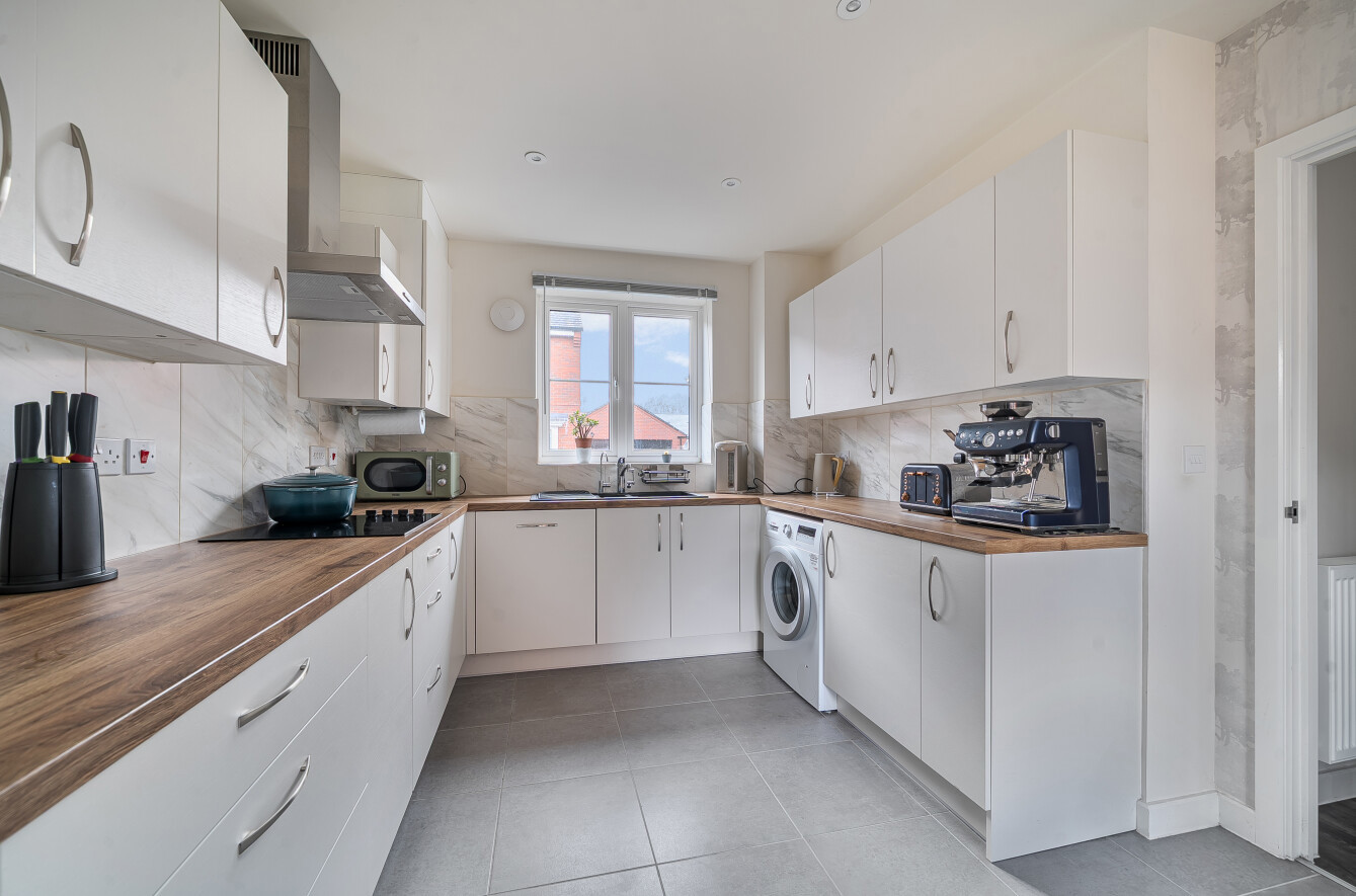 To the left, the generous living room is flooded with natural light and features French doors opening directly onto the rear garden, creating a seamless connection between indoor and outdoor living. To the right of the hallway is a well-appointed kitchen/dining room, offering ample and smart storage solutions, built-in appliances, and plenty of space for a family dining table. This practical and sociable area is perfect for both everyday living and hosting guests.