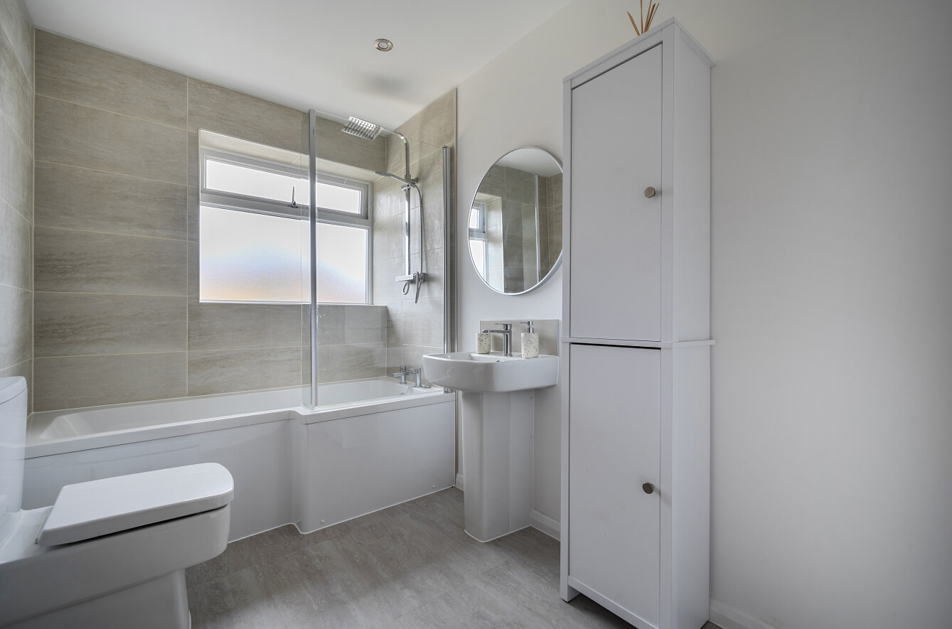 Upstairs, the first floor comprises four well-proportioned bedrooms. The principal bedroom is particularly spacious and benefits from an en-suite shower room. Three further bedrooms offer flexible accommodation suitable for family members, guests or those requiring a home office. A modern family bathroom serves the remaining bedrooms.