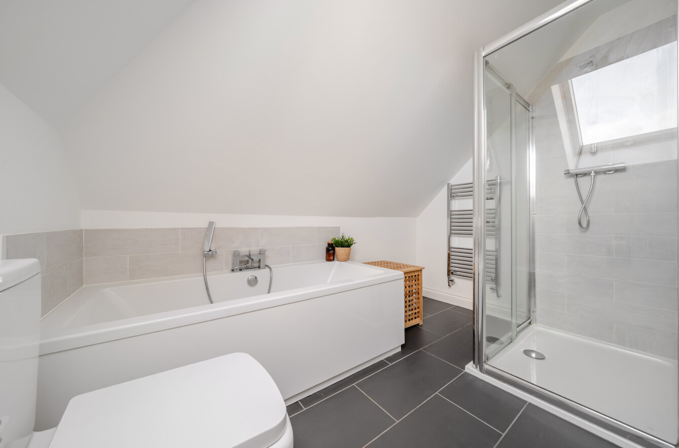 Upstairs, there are three well-proportioned bedrooms and two bathrooms. The principal suite is particularly impressive, featuring a stylish en-suite shower room, a walk-in wardrobe, and views over the rear garden, along with access to a private balcony — an ideal space to relax and unwind.