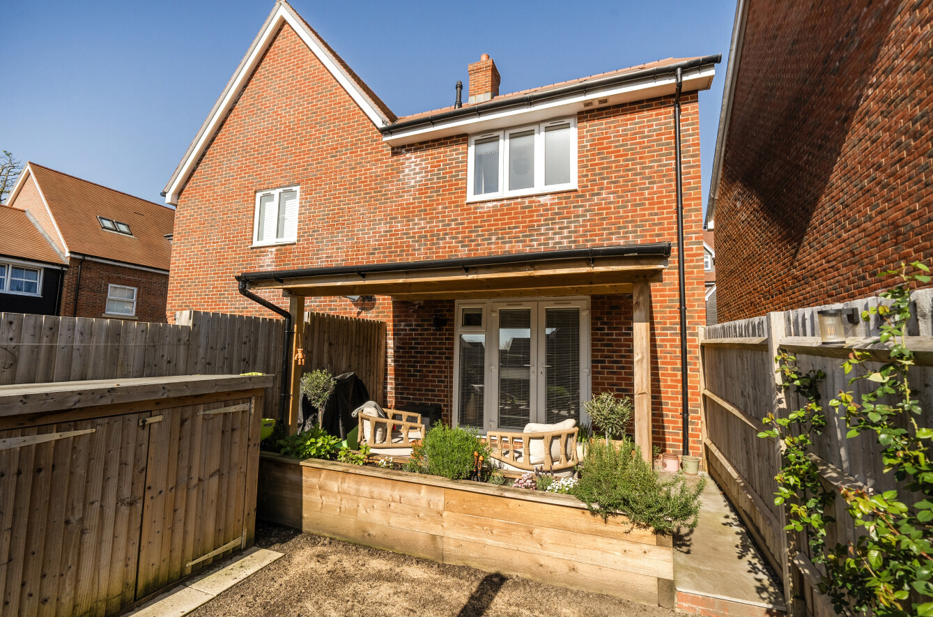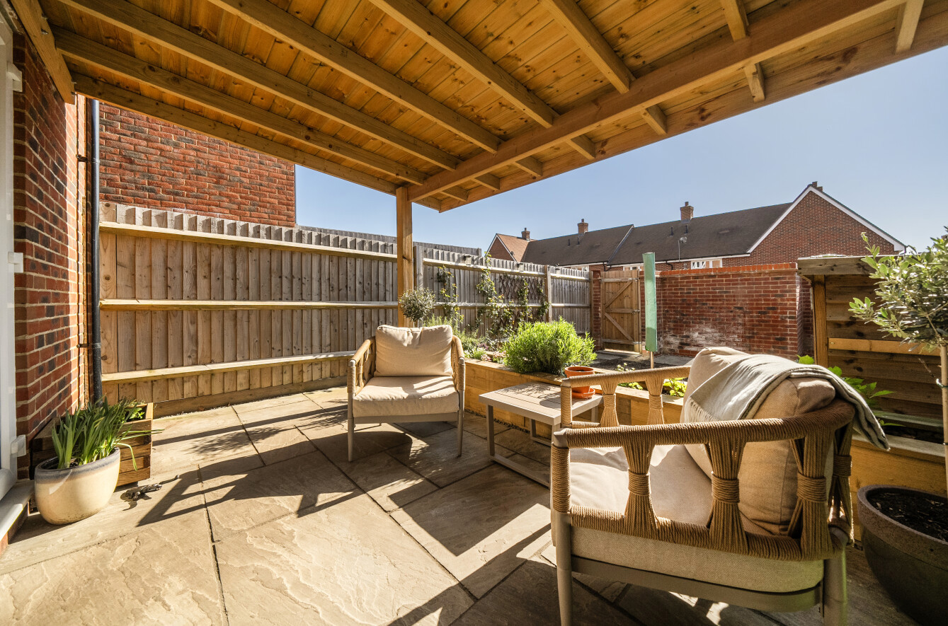 The accommodation includes a large living/dining room, a smart modern kitchen, and a cloakroom on the ground floor. Upstairs are two double size bedrooms, one with an en suite shower room, and a further bathroom serves the other. A well tended lawned garden leads to the front door, while at the rear the garden benefits from a paved patio seating area covered by a wooden awning. There is allocated parking for two vehicles, and as the property has only recently been built in benefits from the remainder of a building warranty.