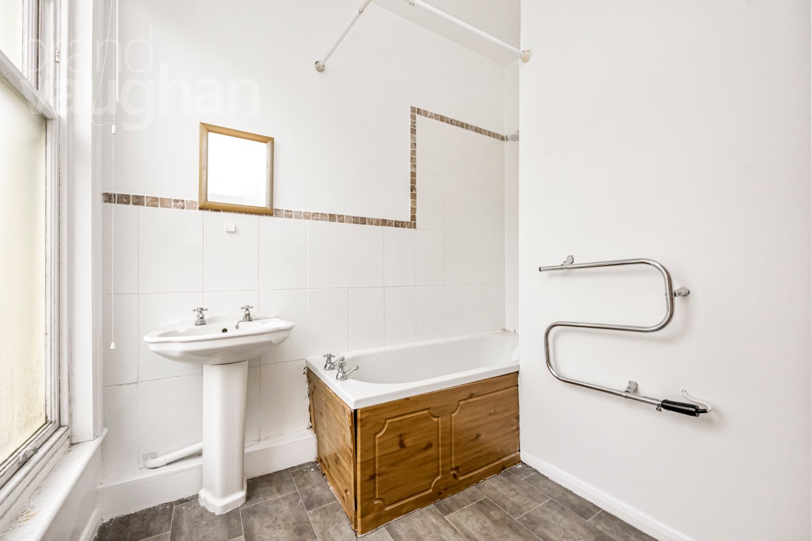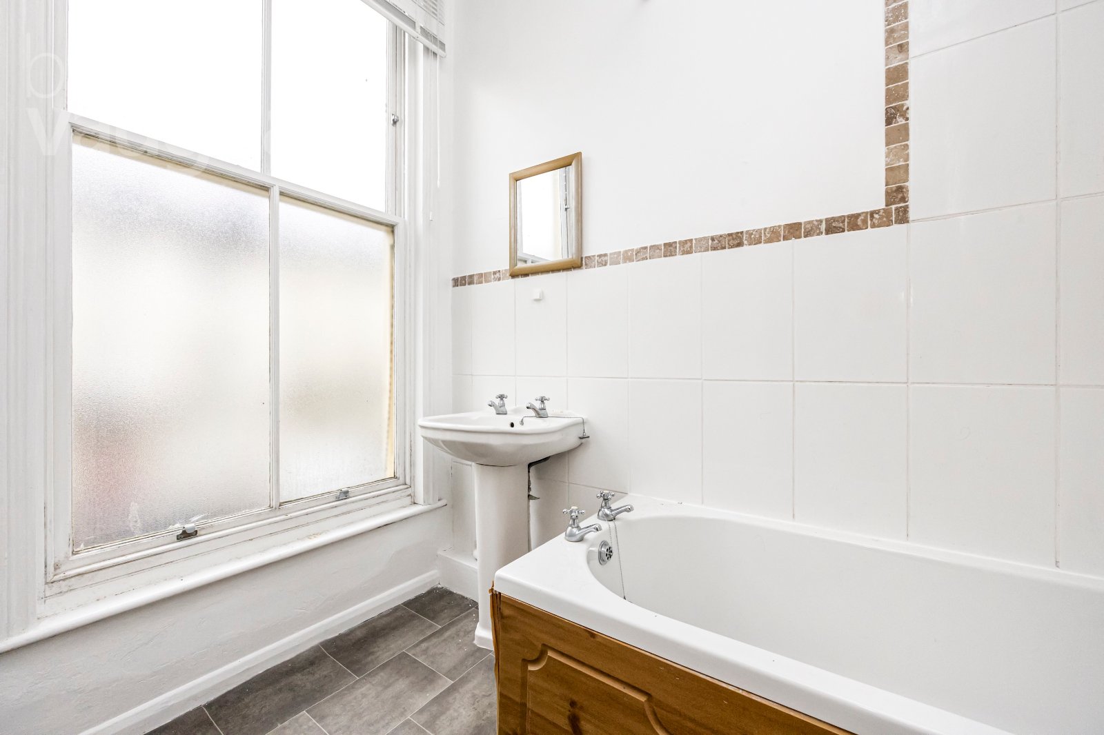 The bathroom is generously proportioned for a studio flat and includes a full-sized bath with shower over, pedestal basin and WC, complemented by tiled walls and flooring. A large frosted window provides natural light and ventilation.